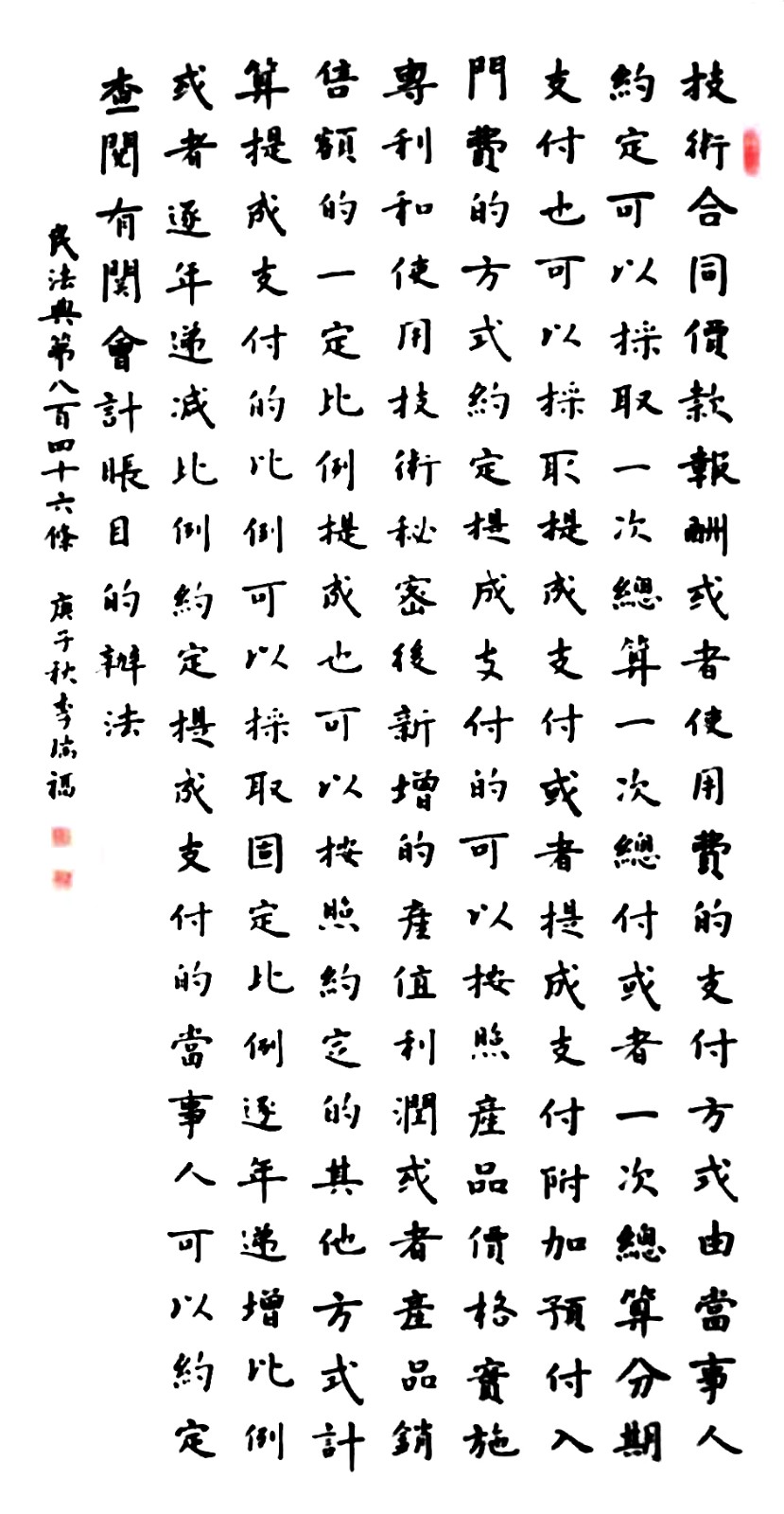 民法典第八百四十六條 技術(shù)合同價(jià)款、報(bào)酬或者使用費(fèi)的支付方式由當(dāng)事人約定,可以采取一次總算、一次總付或者一次總算、分期支付,也可以采取提成支付或者提成支付附加預(yù)付入門(mén)費(fèi)的方式。