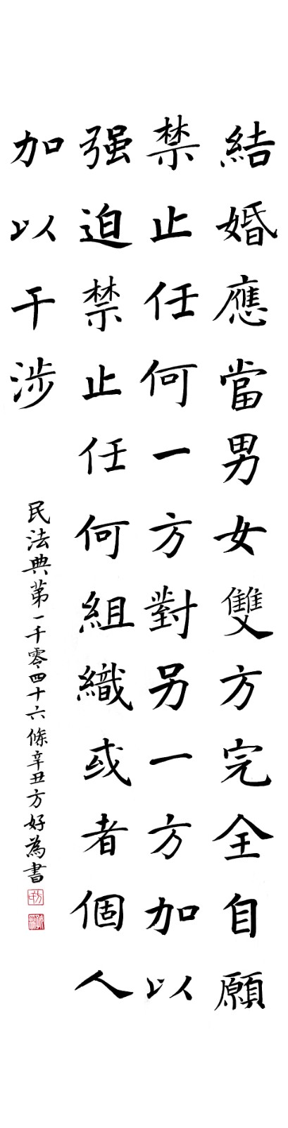 民法典第一千零四十六條 結(jié)婚應當男女雙方完全自愿,禁止任何一方對另一方加以強迫,禁止任何組織或者個人加以干涉。