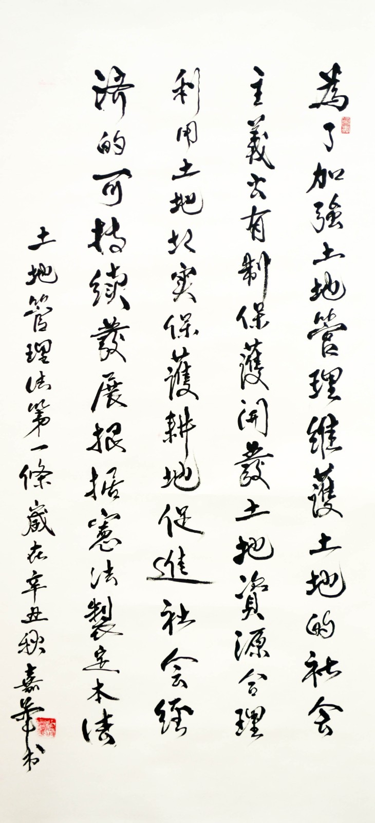 繼1600余位書法家參與書寫《中華人民共和國民法典》全部1260條法條之后,法治日?qǐng)?bào)社聯(lián)合自然資源部法規(guī)司、自然資源部書畫研究會(huì)和北京昌平書法家協(xié)會(huì),將筆端對(duì)準(zhǔn)土地管理“一法一條例”,即《中華人民共和國土地管理法》和《中華人民共和國土地管理法實(shí)施條例》。