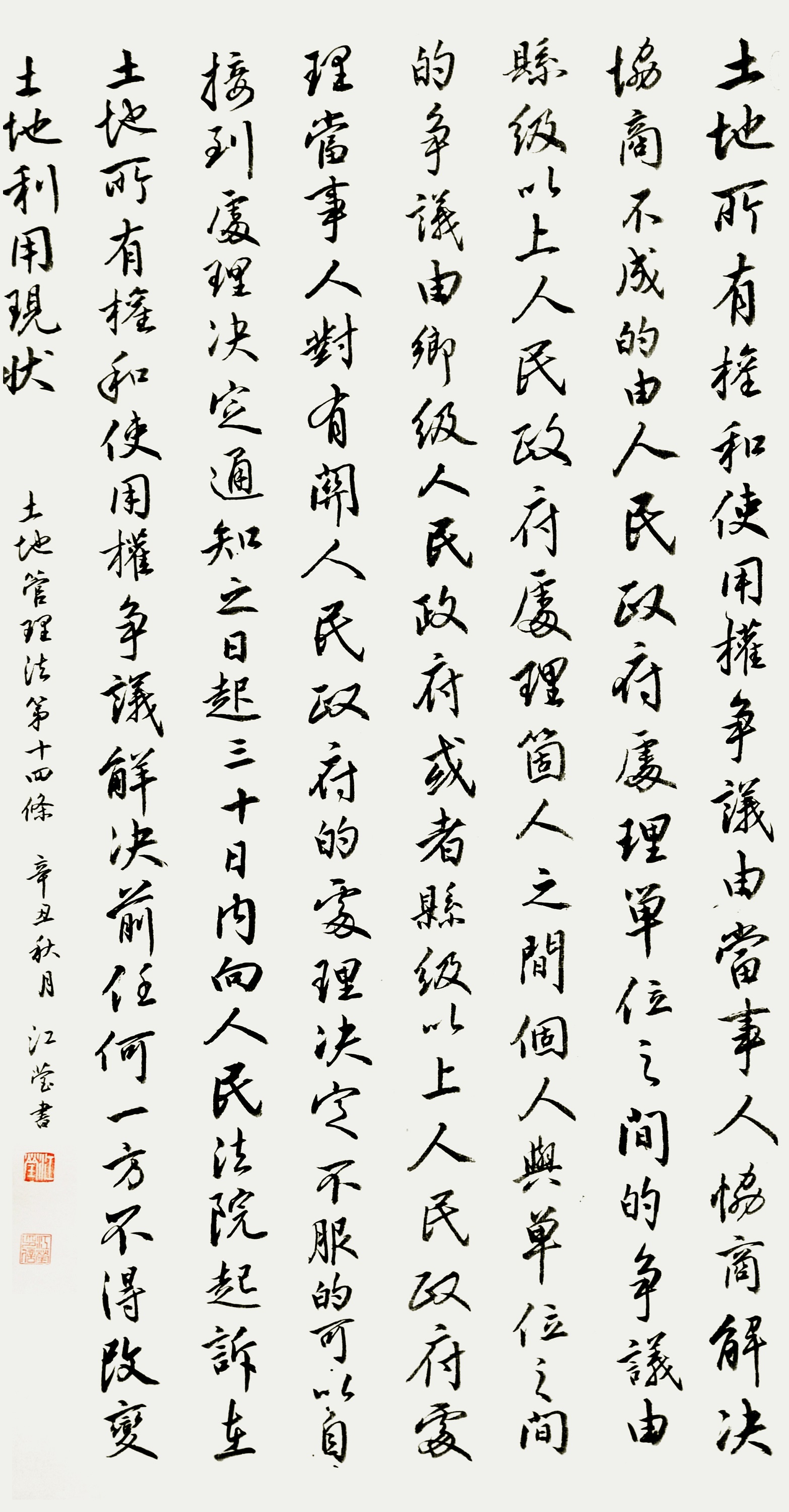 繼1600余位書(shū)法家參與書(shū)寫(xiě)《中華人民共和國(guó)民法典》全部1260條法條之后,法治日?qǐng)?bào)社聯(lián)合自然資源部法規(guī)司、自然資源部書(shū)畫(huà)研究會(huì)和北京昌平書(shū)法家協(xié)會(huì),將筆端對(duì)準(zhǔn)土地管理“一法一條例”,即《中華人民共和國(guó)土地管理法》和《中華人民共和國(guó)土地管理法實(shí)施條例》。