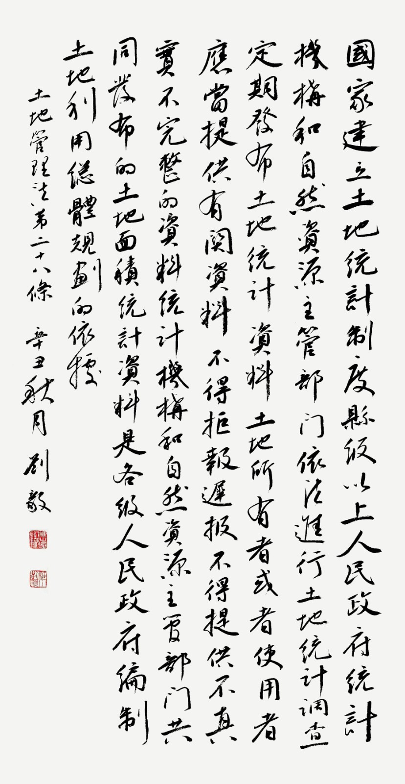 繼1600余位書(shū)法家參與書(shū)寫《中華人民共和國(guó)民法典》全部1260條法條之后,法治日?qǐng)?bào)社聯(lián)合自然資源部法規(guī)司、自然資源部書(shū)畫研究會(huì)和北京昌平書(shū)法家協(xié)會(huì),將筆端對(duì)準(zhǔn)土地管理“一法一條例”,即《中華人民共和國(guó)土地管理法》和《中華人民共和國(guó)土地管理法實(shí)施條例》。