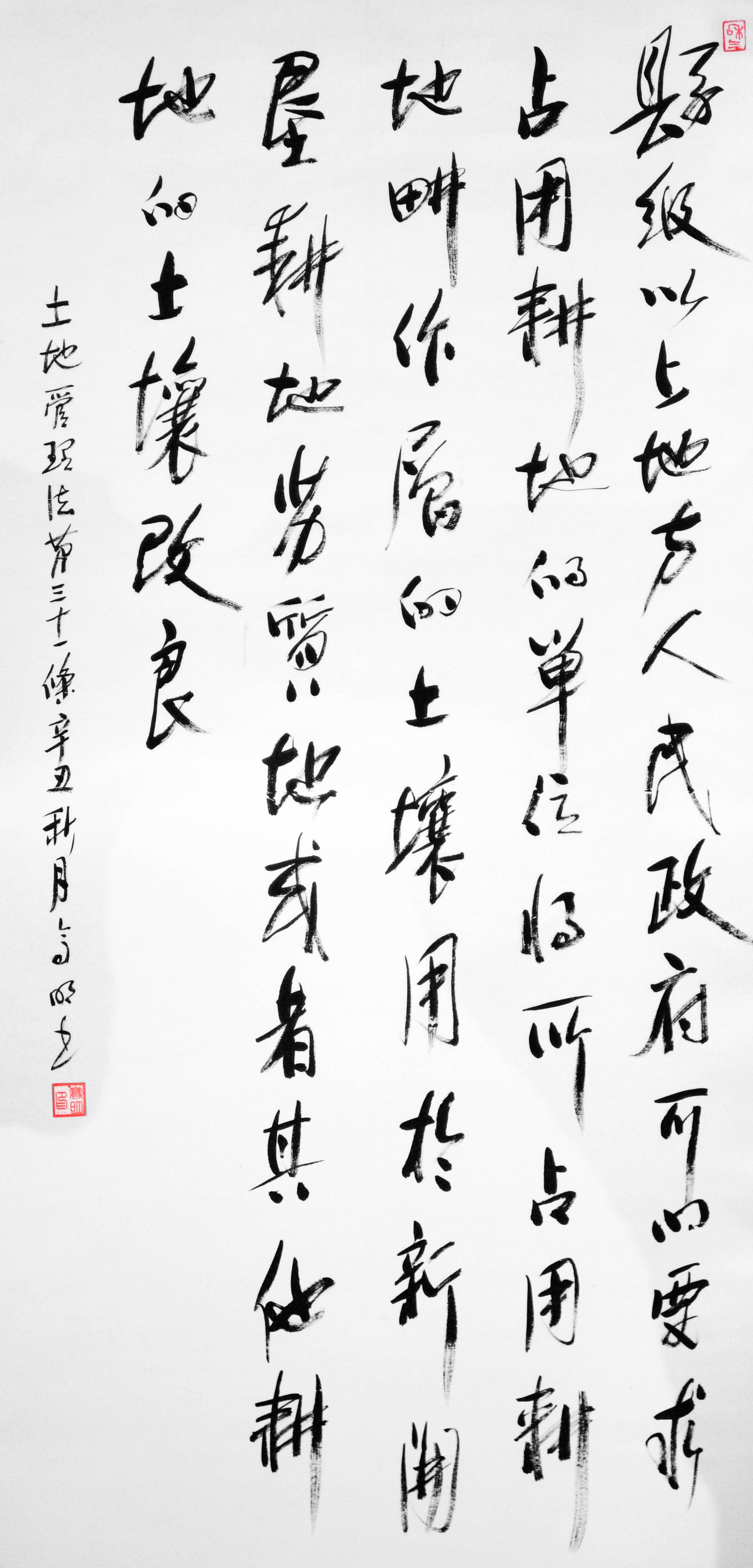 繼1600余位書法家參與書寫《中華人民共和國民法典》全部1260條法條之后,法治日報社聯(lián)合自然資源部法規(guī)司、自然資源部書畫研究會和北京昌平書法家協(xié)會,將筆端對準(zhǔn)土地管理“一法一條例”,即《中華人民共和國土地管理法》和《中華人民共和國土地管理法實(shí)施條例》。