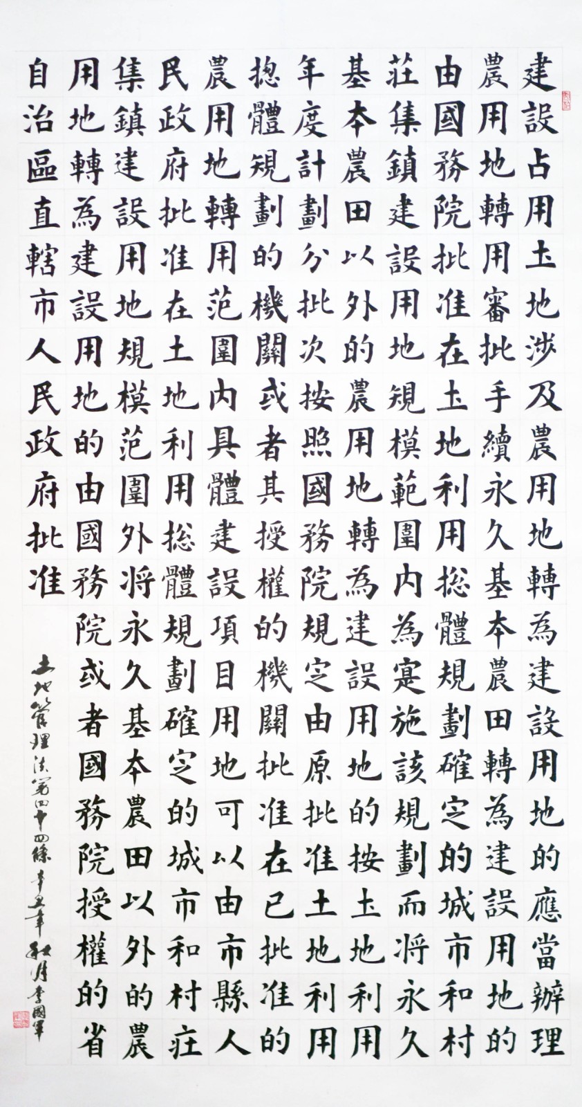 繼1600余位書法家參與書寫《中華人民共和國民法典》全部1260條法條之后,法治日報社聯(lián)合自然資源部法規(guī)司、自然資源部書畫研究會和北京昌平書法家協(xié)會,將筆端對準土地管理“一法一條例”,即《中華人民共和國土地管理法》和《中華人民共和國土地管理法實施條例》。