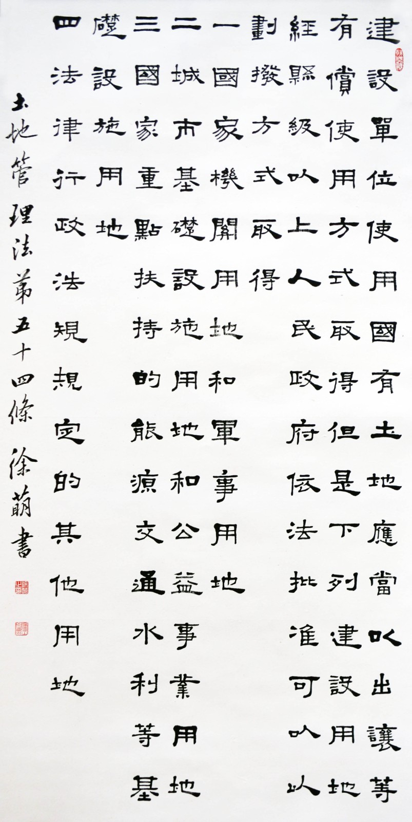 繼1600余位書法家參與書寫《中華人民共和國民法典》全部1260條法條之后,法治日報社聯(lián)合自然資源部法規(guī)司、自然資源部書畫研究會和北京昌平書法家協(xié)會,將筆端對準土地管理“一法一條例”,即《中華人民共和國土地管理法》和《中華人民共和國土地管理法實施條例》。