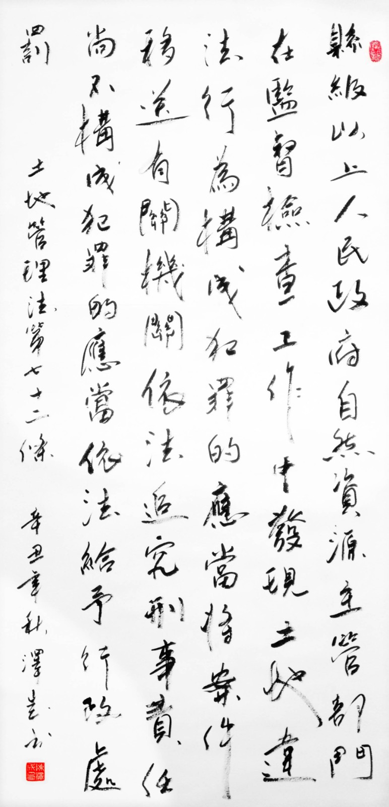 繼1600余位書法家參與書寫《中華人民共和國民法典》全部1260條法條之后,法治日報社聯(lián)合自然資源部法規(guī)司、自然資源部書畫研究會和北京昌平書法家協(xié)會,將筆端對準土地管理“一法一條例”,即《中華人民共和國土地管理法》和《中華人民共和國土地管理法實施條例》。
