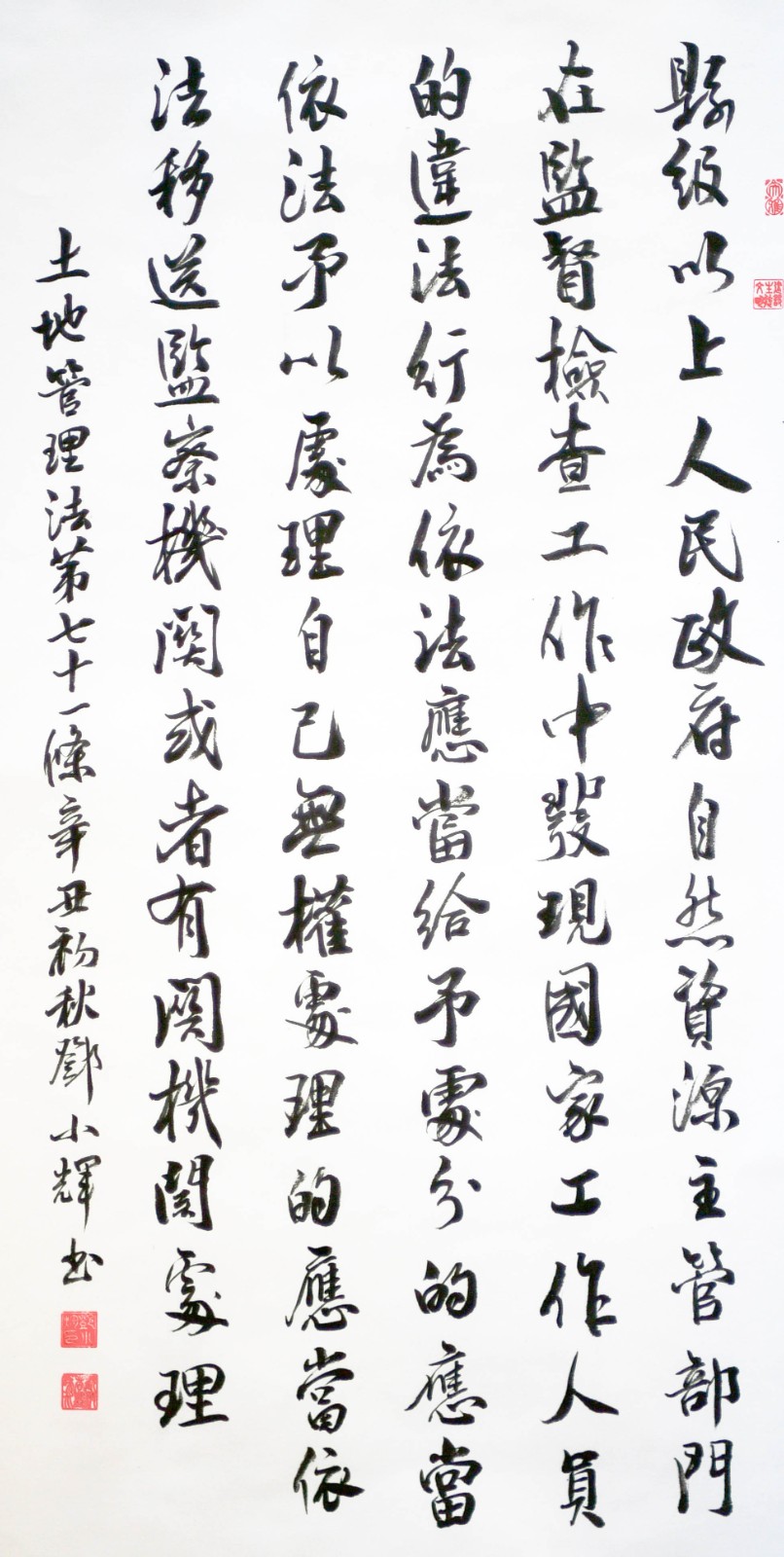 繼1600余位書法家參與書寫《中華人民共和國民法典》全部1260條法條之后,法治日?qǐng)?bào)社聯(lián)合自然資源部法規(guī)司、自然資源部書畫研究會(huì)和北京昌平書法家協(xié)會(huì),將筆端對(duì)準(zhǔn)土地管理“一法一條例”,即《中華人民共和國土地管理法》和《中華人民共和國土地管理法實(shí)施條例》。