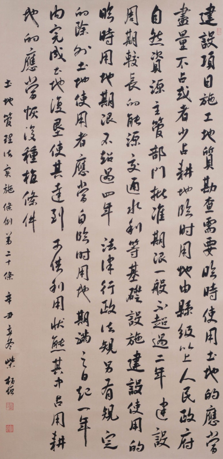 繼1600余位書(shū)法家參與書(shū)寫(xiě)《中華人民共和國(guó)民法典》全部1260條法條之后,法治日?qǐng)?bào)社聯(lián)合自然資源部法規(guī)司、自然資源部書(shū)畫(huà)研究會(huì)和北京昌平書(shū)法家協(xié)會(huì),將筆端對(duì)準(zhǔn)土地管理“一法一條例”,即《中華人民共和國(guó)土地管理法》和《中華人民共和國(guó)土地管理法實(shí)施條例》。