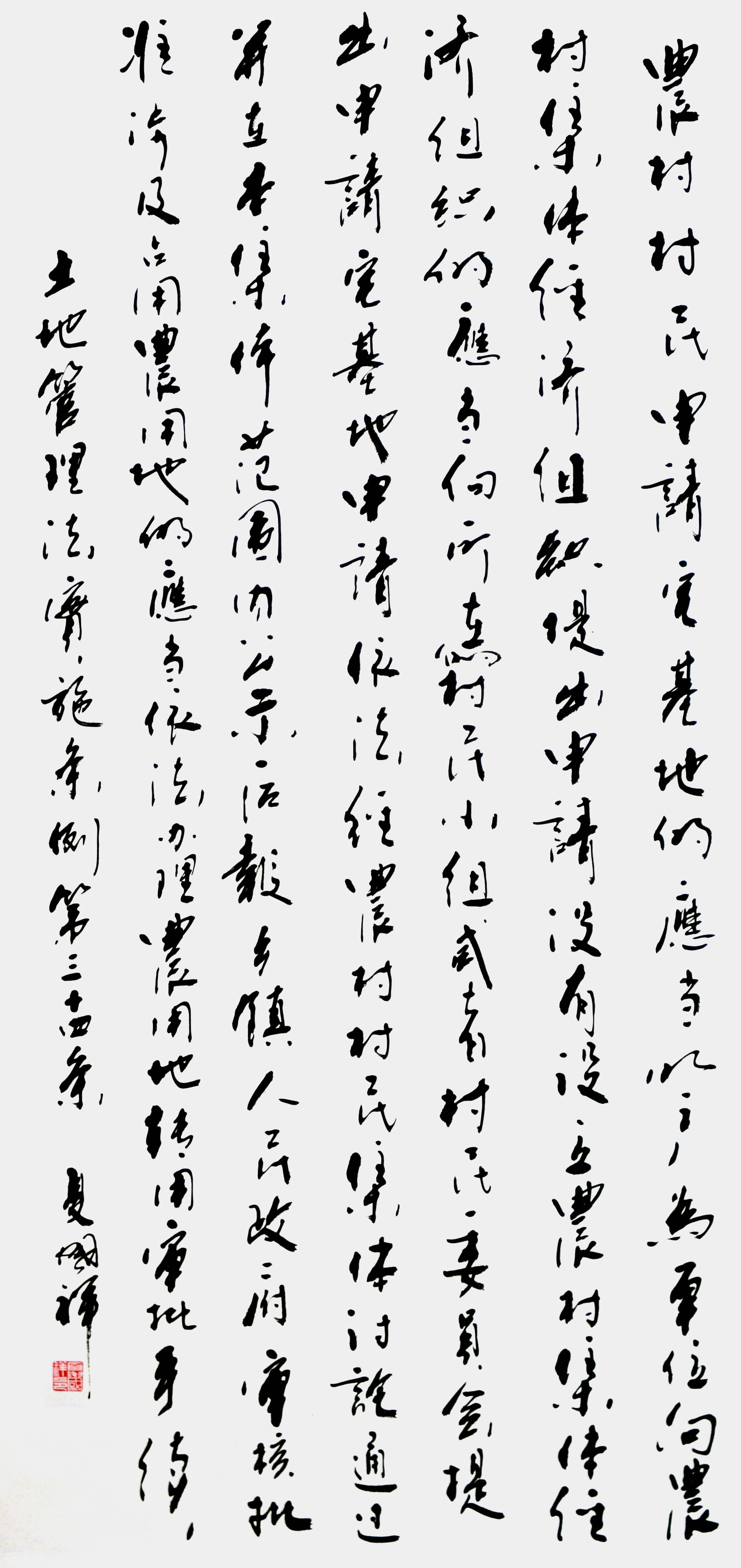 繼1600余位書法家參與書寫《中華人民共和國民法典》全部1260條法條之后,法治日?qǐng)?bào)社聯(lián)合自然資源部法規(guī)司、自然資源部書畫研究會(huì)和北京昌平書法家協(xié)會(huì),將筆端對(duì)準(zhǔn)土地管理“一法一條例”,即《中華人民共和國土地管理法》和《中華人民共和國土地管理法實(shí)施條例》。