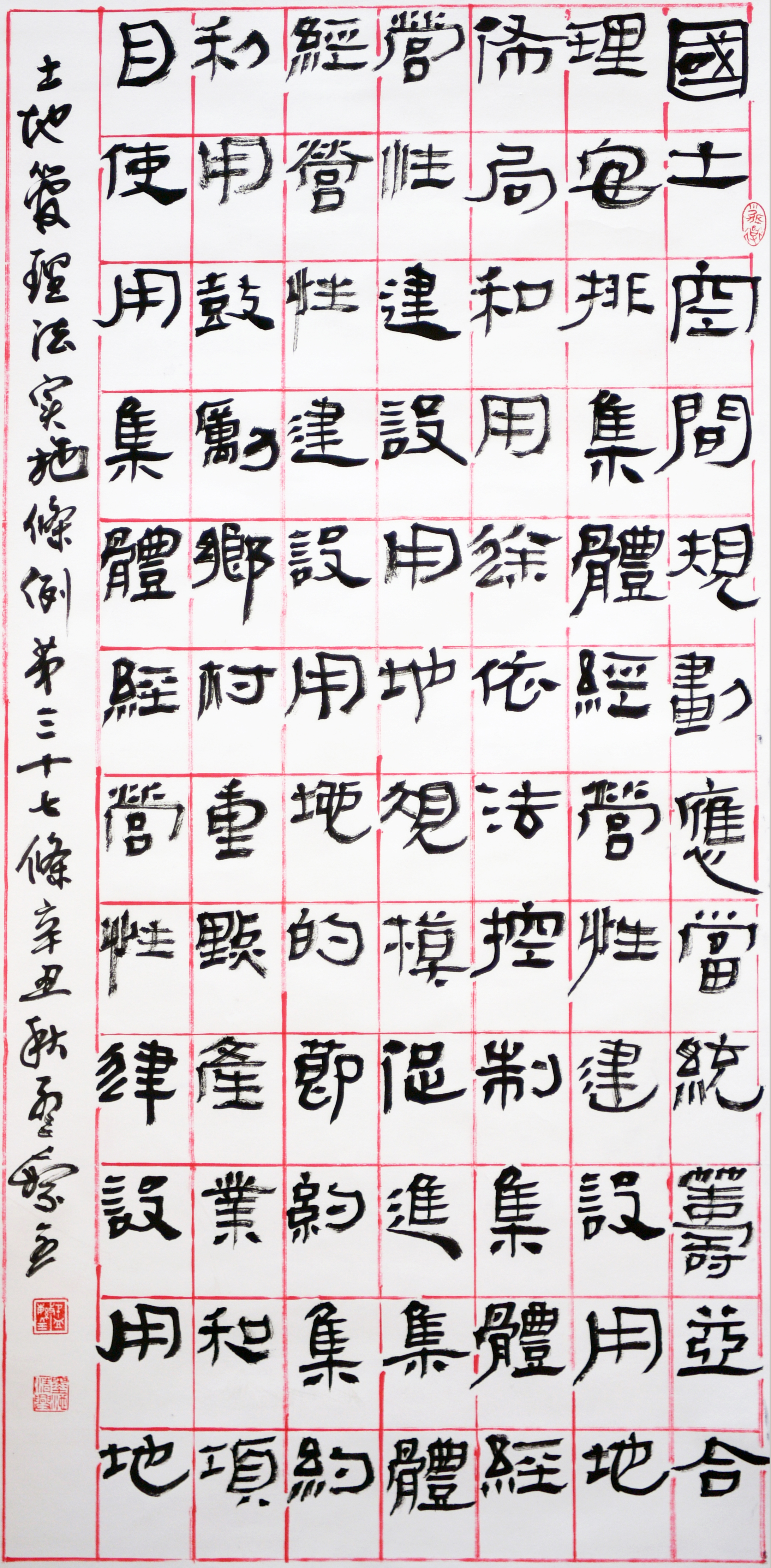 繼1600余位書法家參與書寫《中華人民共和國民法典》全部1260條法條之后,法治日報社聯(lián)合自然資源部法規(guī)司、自然資源部書畫研究會和北京昌平書法家協(xié)會,將筆端對準土地管理“一法一條例”,即《中華人民共和國土地管理法》和《中華人民共和國土地管理法實施條例》。
