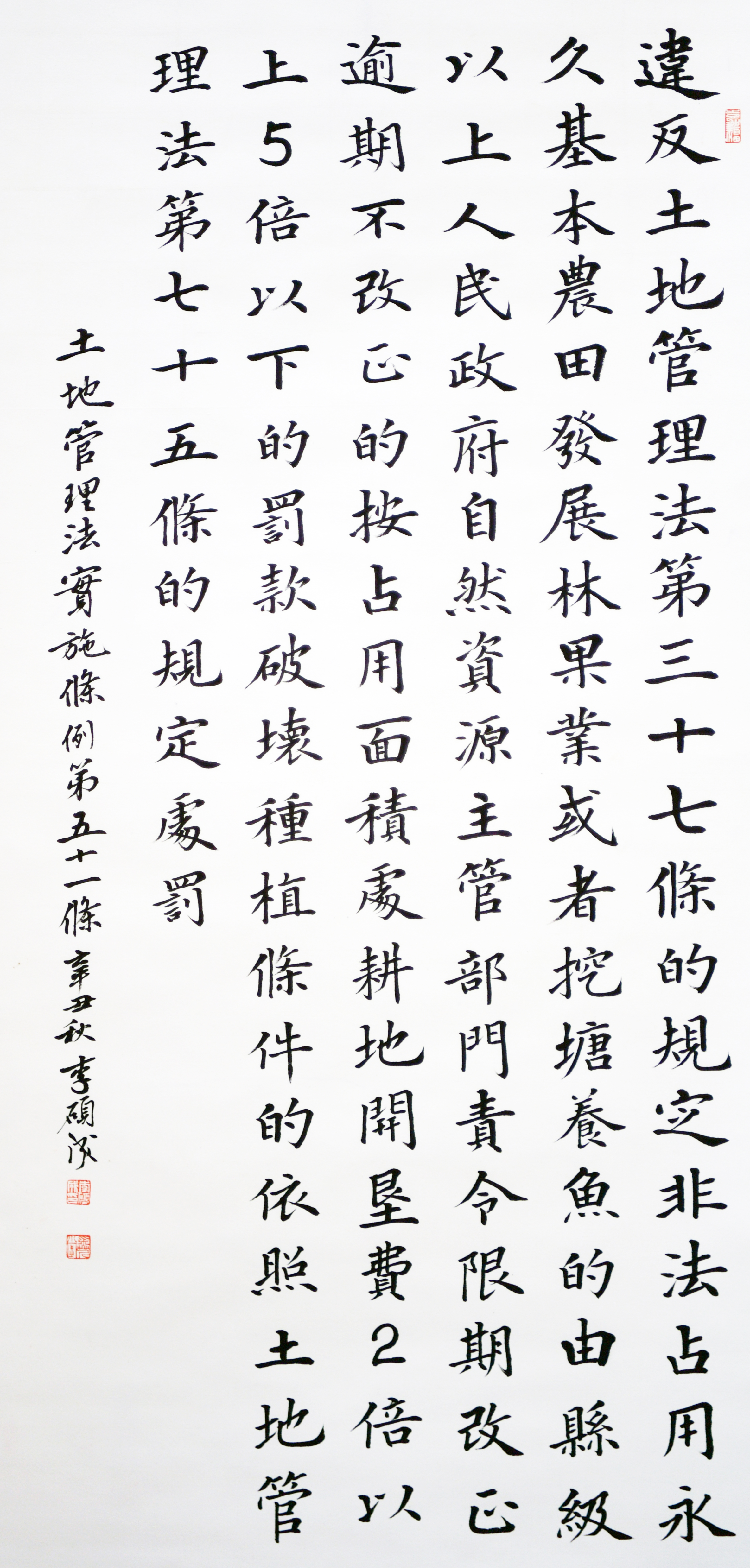 繼1600余位書法家參與書寫《中華人民共和國民法典》全部1260條法條之后,法治日報社聯(lián)合自然資源部法規(guī)司、自然資源部書畫研究會和北京昌平書法家協(xié)會,將筆端對準(zhǔn)土地管理“一法一條例”,即《中華人民共和國土地管理法》和《中華人民共和國土地管理法實施條例》。