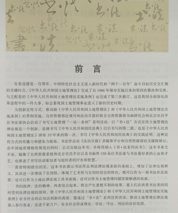 書以馭字,法以興邦;書法一體,墨法同彰。本書既可以作為一部書法作品欣賞,也可以作為土地法律法規(guī)工具書查閱,還可以作為土地管理問題答疑解惑的指南。希望這套叢書可以讓讀者在欣賞書法美的同時(shí)受到法律法規(guī)的浸潤,推動(dòng)土地管理法律法規(guī)深入各行各業(yè)、走進(jìn)千家萬戶,在全社會(huì)形成尊法、學(xué)法、守法、用法的良好氛圍。