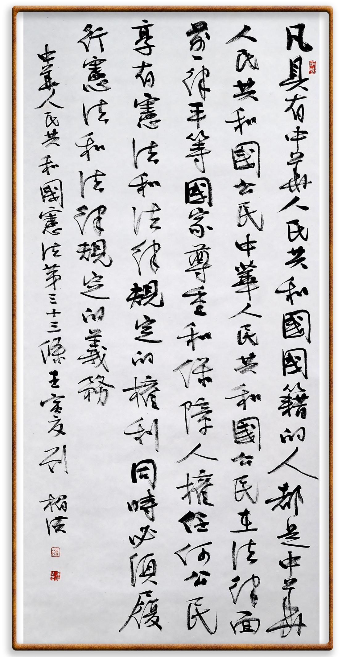 繼《中華人民共和國民法典》《中華人民共和國土地管理法》《中華人民共和國土地管理法實施條例》《中華人民共和國法律援助法》之后,法治日報社聯(lián)合北京市司法局、北京市書法家協(xié)會,將筆端對準《中華人民共和國憲法》和《中華人民共和國行政處罰法》。