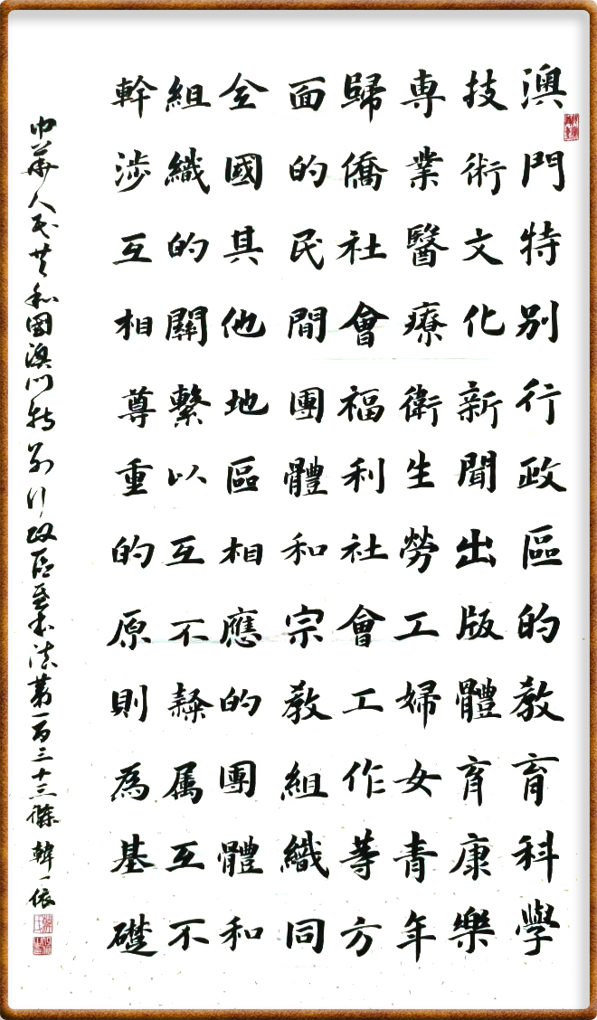 澳門(mén)基本法第一百三十三條 澳門(mén)特別行政區(qū)的教育、科學(xué)、技術(shù)、文化、新聞、出版、體育、康樂(lè)、專(zhuān)業(yè)、醫(yī)療衛(wèi)生、勞工、婦女、青年、歸僑、社會(huì)福利、社會(huì)工作等方面的民間團(tuán)體和宗教組織同全國(guó)其他地區(qū)相應(yīng)的團(tuán)體和組織的關(guān)系,以互不隸屬、互不干涉、互相尊重的原則為基礎(chǔ)。
