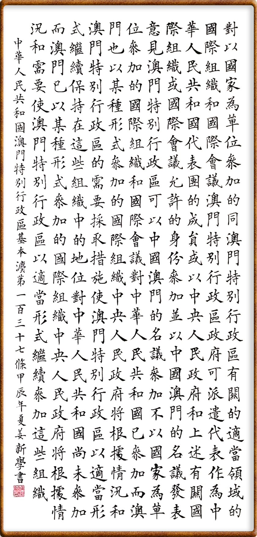 澳門基本法第一百三十七條 對以國家為單位參加的、同澳門特別行政區(qū)有關(guān)的、適當(dāng)領(lǐng)域的國際組織和國際會議,澳門特別行政區(qū)政府可派遣代表作為中華人民共和國代表團的成員或以中央人民政府和上述有關(guān)國際組織或國際會議允許的身份參加,并以“中國澳門”的名義發(fā)表意見。