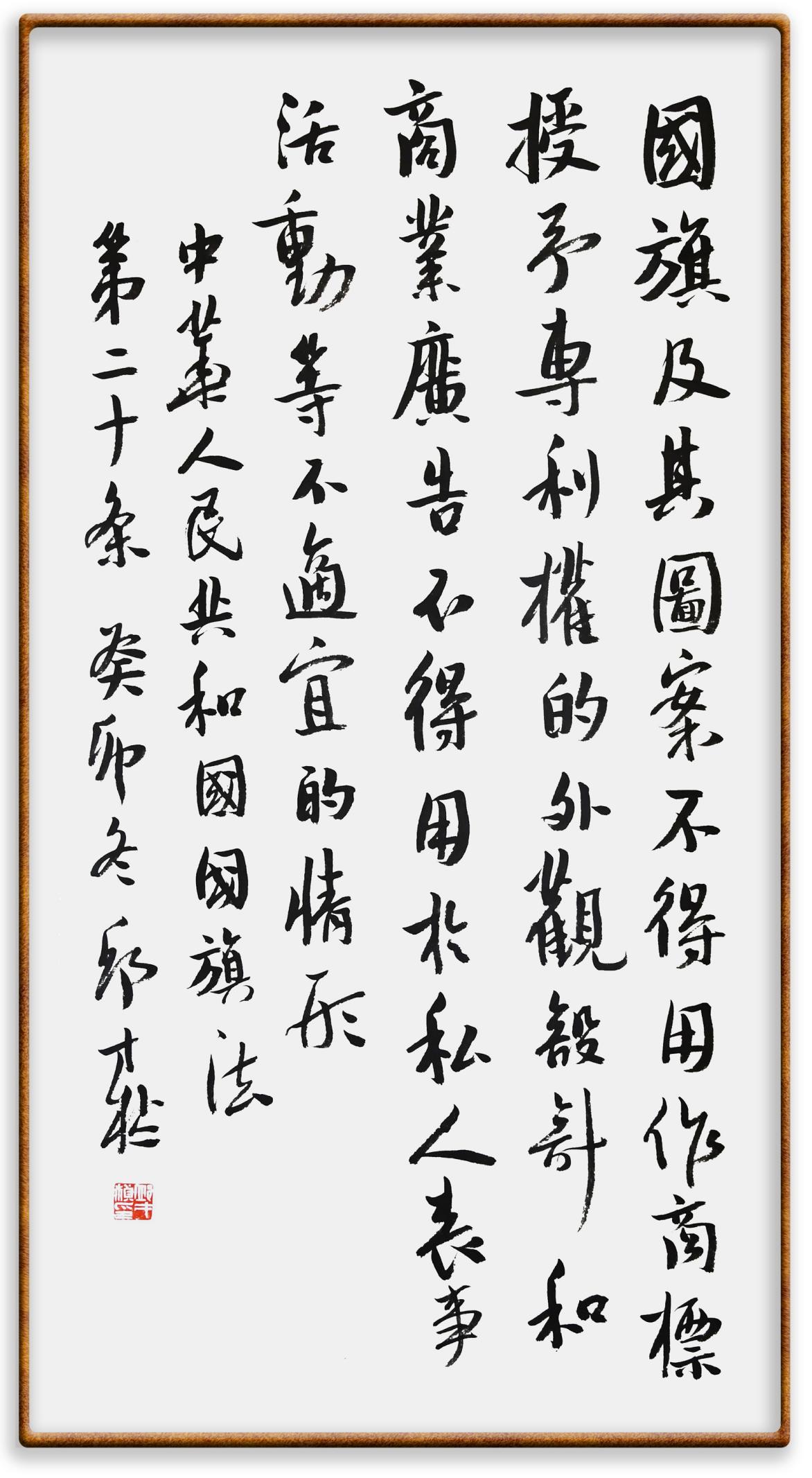 國(guó)旗法第二十條 國(guó)旗及其圖案不得用作商標(biāo)、授予專(zhuān)利權(quán)的外觀設(shè)計(jì)和商業(yè)廣告,不得用于私人喪事活動(dòng)等不適宜的情形。