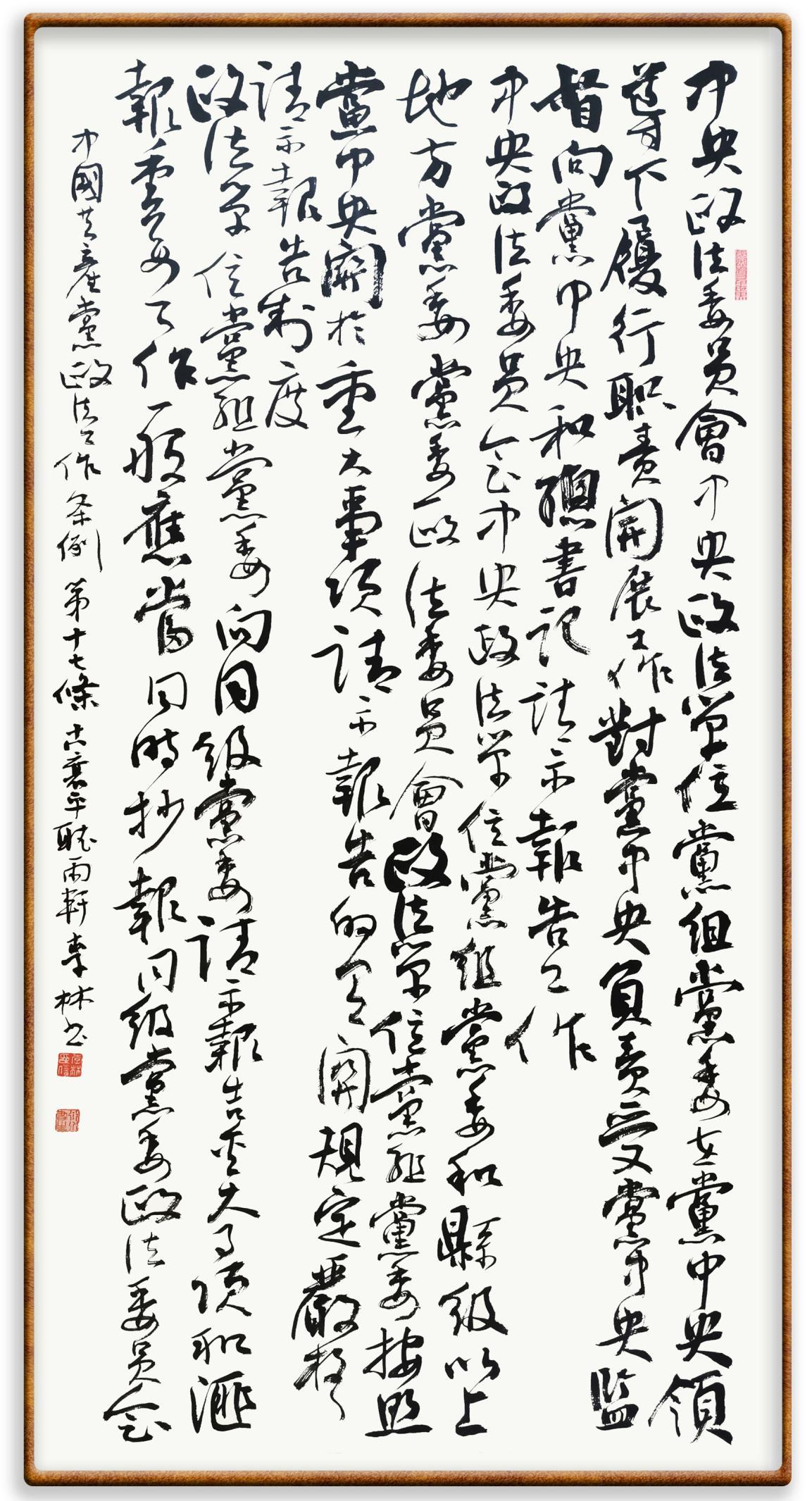 《中國共產(chǎn)黨政法工作條例》對(duì)黨領(lǐng)導(dǎo)新時(shí)代政法工作進(jìn)行全面制度擘畫,為黨領(lǐng)導(dǎo)政法工作提供基本遵循,具有重大而深遠(yuǎn)的意義。為學(xué)習(xí)好、宣傳好、貫徹好、實(shí)施好這部黨內(nèi)法規(guī),繼《中華人民共和國民法典》《中華人民共和國憲法》《信訪工作條例》《中華人民共和國澳門特別行政區(qū)基本法》《中華人民共和國香港特別行政區(qū)基本法》等法律法規(guī)之后,“書·法”系列活動(dòng)將筆端對(duì)準(zhǔn)《中國共產(chǎn)黨政法工作條例》。