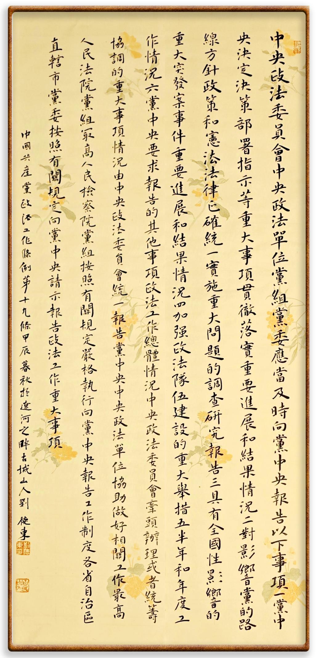 《中國共產(chǎn)黨政法工作條例》對黨領(lǐng)導(dǎo)新時代政法工作進(jìn)行全面制度擘畫,為黨領(lǐng)導(dǎo)政法工作提供基本遵循,具有重大而深遠(yuǎn)的意義。為學(xué)習(xí)好、宣傳好、貫徹好、實施好這部黨內(nèi)法規(guī),繼《中華人民共和國民法典》《中華人民共和國憲法》《信訪工作條例》《中華人民共和國澳門特別行政區(qū)基本法》《中華人民共和國香港特別行政區(qū)基本法》等法律法規(guī)之后,“書·法”系列活動將筆端對準(zhǔn)《中國共產(chǎn)黨政法工作條例》。
