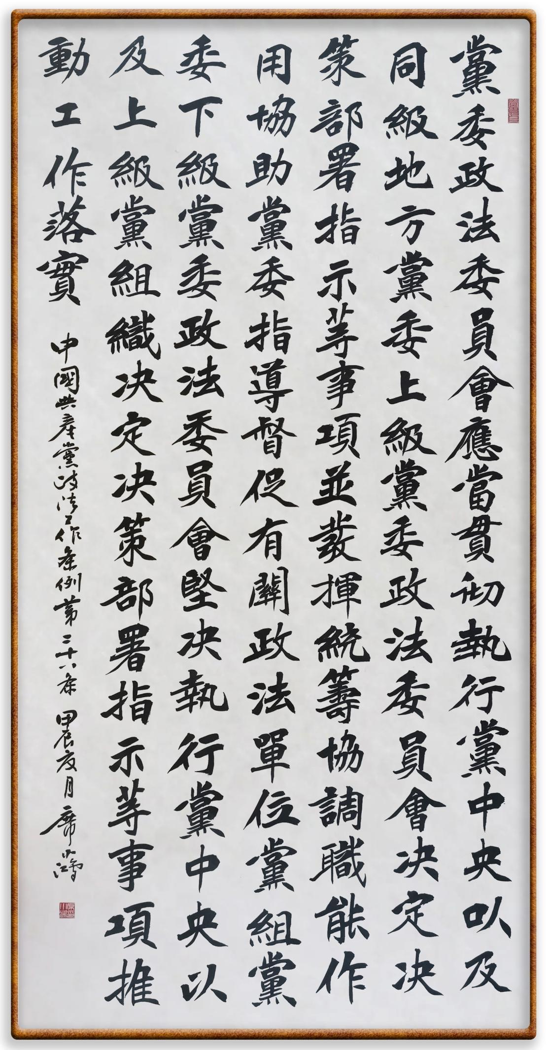 《中國共產(chǎn)黨政法工作條例》對黨領導新時代政法工作進行全面制度擘畫,為黨領導政法工作提供基本遵循,具有重大而深遠的意義。為學習好、宣傳好、貫徹好、實施好這部黨內(nèi)法規(guī),繼《中華人民共和國民法典》《中華人民共和國憲法》《信訪工作條例》《中華人民共和國澳門特別行政區(qū)基本法》《中華人民共和國香港特別行政區(qū)基本法》等法律法規(guī)之后,“書·法”系列活動將筆端對準《中國共產(chǎn)黨政法工作條例》。