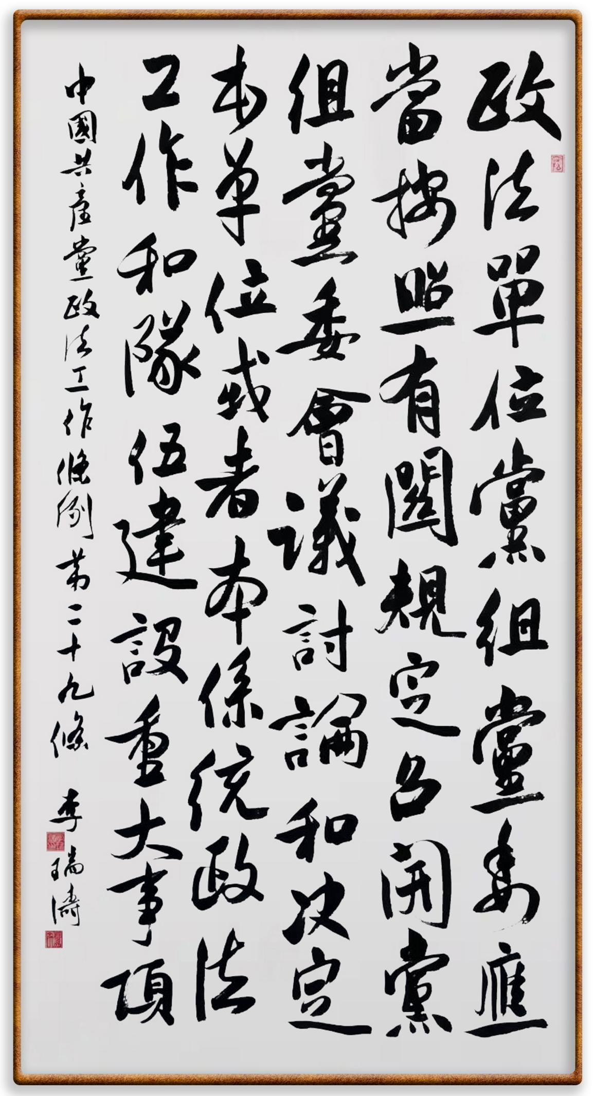 《中國共產(chǎn)黨政法工作條例》對黨領(lǐng)導(dǎo)新時代政法工作進(jìn)行全面制度擘畫,為黨領(lǐng)導(dǎo)政法工作提供基本遵循,具有重大而深遠(yuǎn)的意義。為學(xué)習(xí)好、宣傳好、貫徹好、實(shí)施好這部黨內(nèi)法規(guī),繼《中華人民共和國民法典》《中華人民共和國憲法》《信訪工作條例》《中華人民共和國澳門特別行政區(qū)基本法》《中華人民共和國香港特別行政區(qū)基本法》等法律法規(guī)之后,“書·法”系列活動將筆端對準(zhǔn)《中國共產(chǎn)黨政法工作條例》。