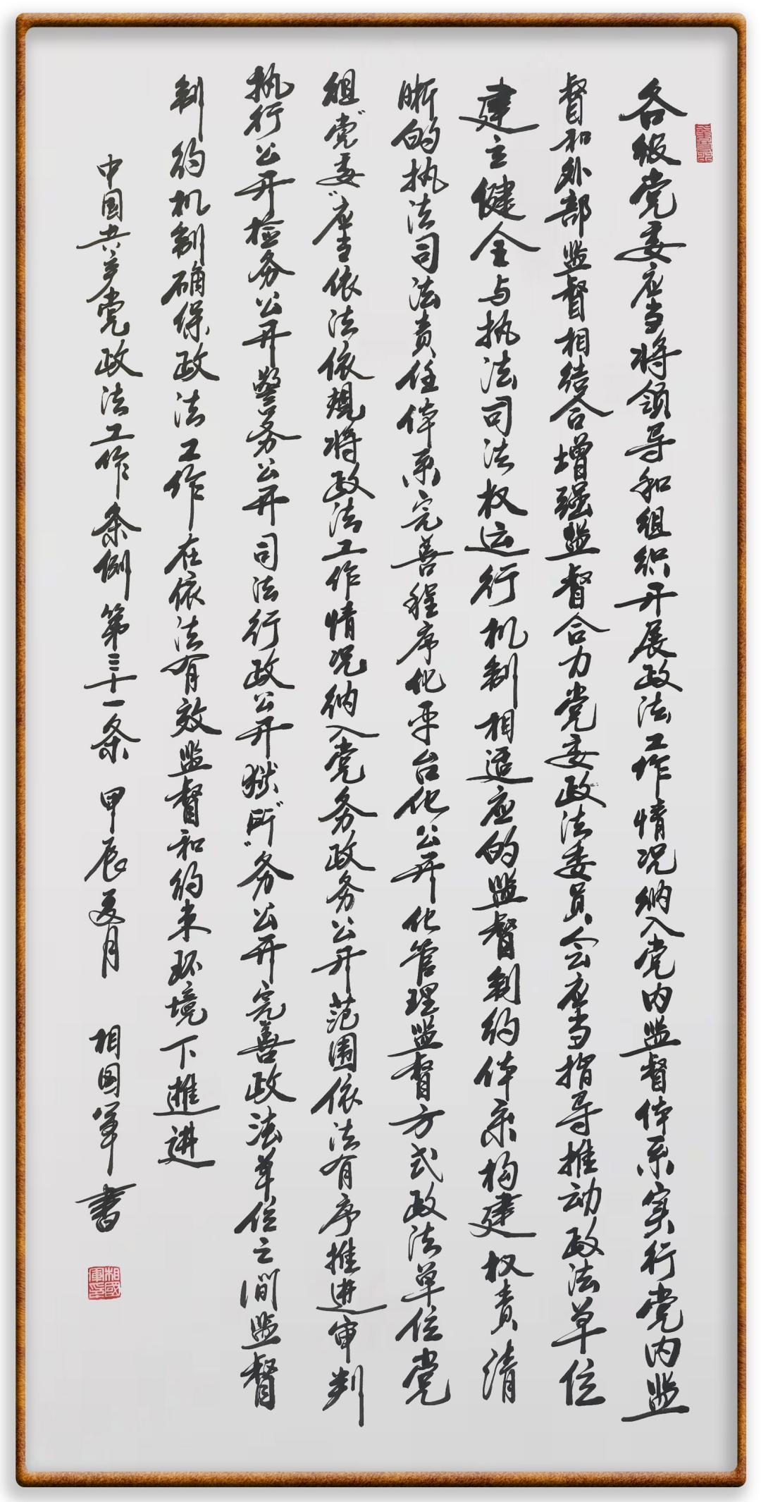 《中國共產(chǎn)黨政法工作條例》對黨領(lǐng)導(dǎo)新時代政法工作進行全面制度擘畫,為黨領(lǐng)導(dǎo)政法工作提供基本遵循,具有重大而深遠的意義。為學(xué)習(xí)好、宣傳好、貫徹好、實施好這部黨內(nèi)法規(guī),繼《中華人民共和國民法典》《中華人民共和國憲法》《信訪工作條例》《中華人民共和國澳門特別行政區(qū)基本法》《中華人民共和國香港特別行政區(qū)基本法》等法律法規(guī)之后,“書·法”系列活動將筆端對準《中國共產(chǎn)黨政法工作條例》。