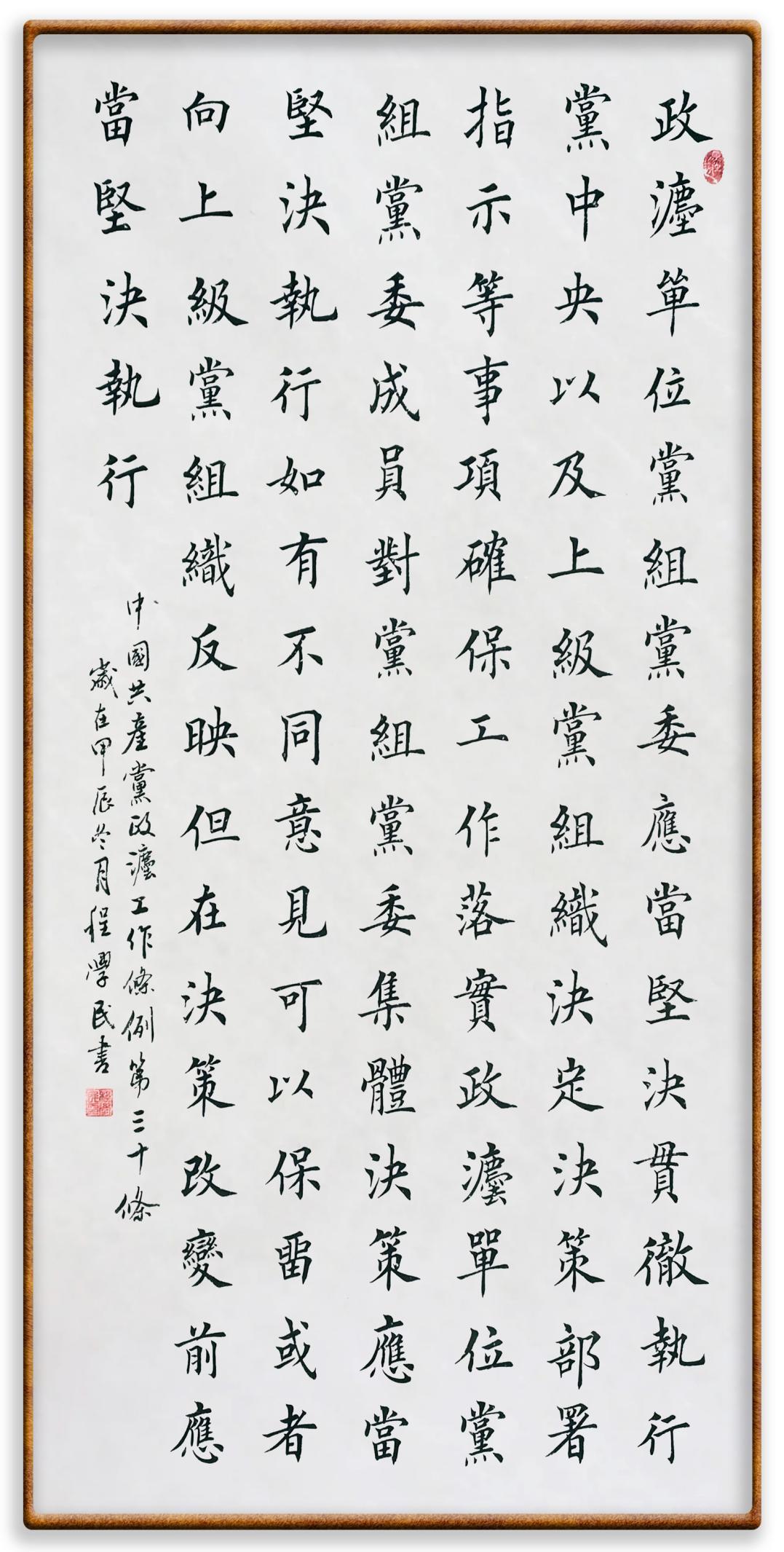 《中國共產(chǎn)黨政法工作條例》對黨領(lǐng)導(dǎo)新時代政法工作進(jìn)行全面制度擘畫,為黨領(lǐng)導(dǎo)政法工作提供基本遵循,具有重大而深遠(yuǎn)的意義。為學(xué)習(xí)好、宣傳好、貫徹好、實(shí)施好這部黨內(nèi)法規(guī),繼《中華人民共和國民法典》《中華人民共和國憲法》《信訪工作條例》《中華人民共和國澳門特別行政區(qū)基本法》《中華人民共和國香港特別行政區(qū)基本法》等法律法規(guī)之后,“書·法”系列活動將筆端對準(zhǔn)《中國共產(chǎn)黨政法工作條例》。