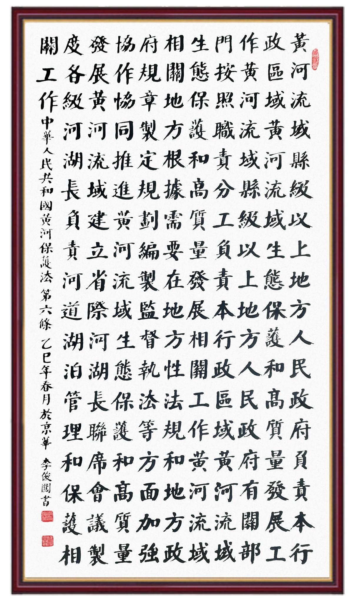 黃河寧,天下平。黃河是中華民族的發(fā)源地和搖籃,保護(hù)黃河是事關(guān)中華民族偉大復(fù)興的千秋大計(jì)?!吨腥A人民共和國(guó)黃河保護(hù)法》為推進(jìn)水資源節(jié)約集約利用、保護(hù)傳承弘揚(yáng)黃河文化、推動(dòng)黃河流域生態(tài)保護(hù)和高質(zhì)量發(fā)展提供了有力法治保障。繼書寫《中華人民共和國(guó)民法典》《中華人民共和國(guó)憲法》《中華人民共和國(guó)澳門特別行政區(qū)基本法》《中華人民共和國(guó)香港特別行政區(qū)基本法》《中華人民共和國(guó)國(guó)旗法》《中華人民共和國(guó)國(guó)徽法》《中華人民共和國(guó)國(guó)歌法》《中華人民共和國(guó)法官法》等法律法規(guī)之后,法制日?qǐng)?bào)社聯(lián)合沿黃九省(區(qū))司法廳、書法家協(xié)會(huì),將筆端對(duì)準(zhǔn)《中華人民共和國(guó)黃河保護(hù)法》。