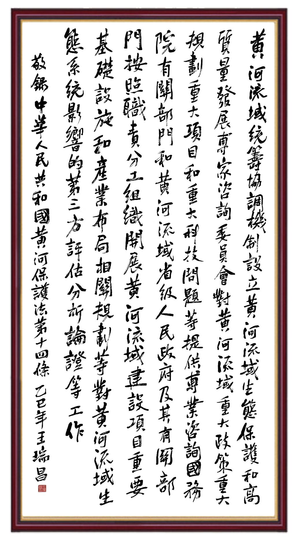 黃河寧,天下平。黃河是中華民族的發(fā)源地和搖籃,保護(hù)黃河是事關(guān)中華民族偉大復(fù)興的千秋大計?!吨腥A人民共和國黃河保護(hù)法》為推進(jìn)水資源節(jié)約集約利用、保護(hù)傳承弘揚黃河文化、推動黃河流域生態(tài)保護(hù)和高質(zhì)量發(fā)展提供了有力法治保障。繼書寫《中華人民共和國民法典》《中華人民共和國憲法》《中華人民共和國澳門特別行政區(qū)基本法》《中華人民共和國香港特別行政區(qū)基本法》《中華人民共和國國旗法》《中華人民共和國國徽法》《中華人民共和國國歌法》《中華人民共和國法官法》等法律法規(guī)之后,法制日報社聯(lián)合沿黃九省(區(qū))司法廳、書法家協(xié)會,將筆端對準(zhǔn)《中華人民共和國黃河保護(hù)法》。