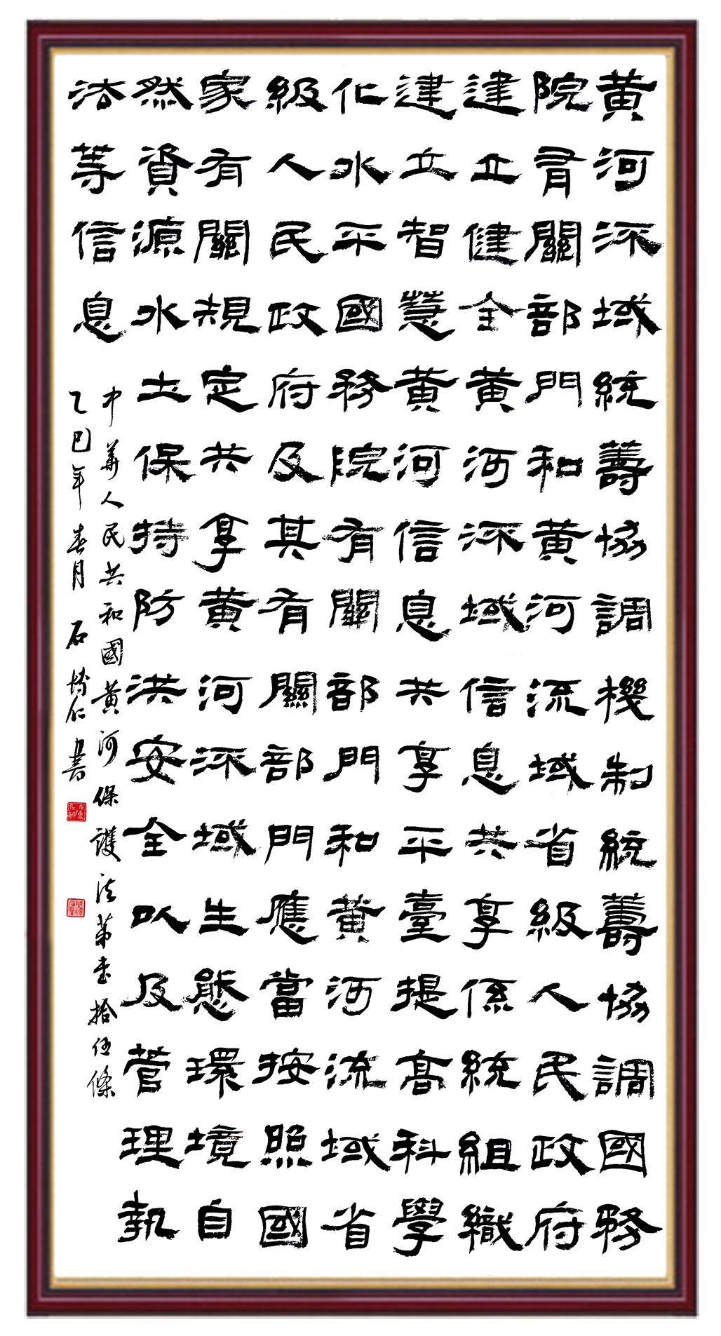 黃河寧,天下平。黃河是中華民族的發(fā)源地和搖籃,保護黃河是事關中華民族偉大復興的千秋大計?!吨腥A人民共和國黃河保護法》為推進水資源節(jié)約集約利用、保護傳承弘揚黃河文化、推動黃河流域生態(tài)保護和高質量發(fā)展提供了有力法治保障。繼書寫《中華人民共和國民法典》《中華人民共和國憲法》《中華人民共和國澳門特別行政區(qū)基本法》《中華人民共和國香港特別行政區(qū)基本法》《中華人民共和國國旗法》《中華人民共和國國徽法》《中華人民共和國國歌法》《中華人民共和國法官法》等法律法規(guī)之后,法制日報社聯合沿黃九?。▍^(qū))司法廳、書法家協會,將筆端對準《中華人民共和國黃河保護法》。