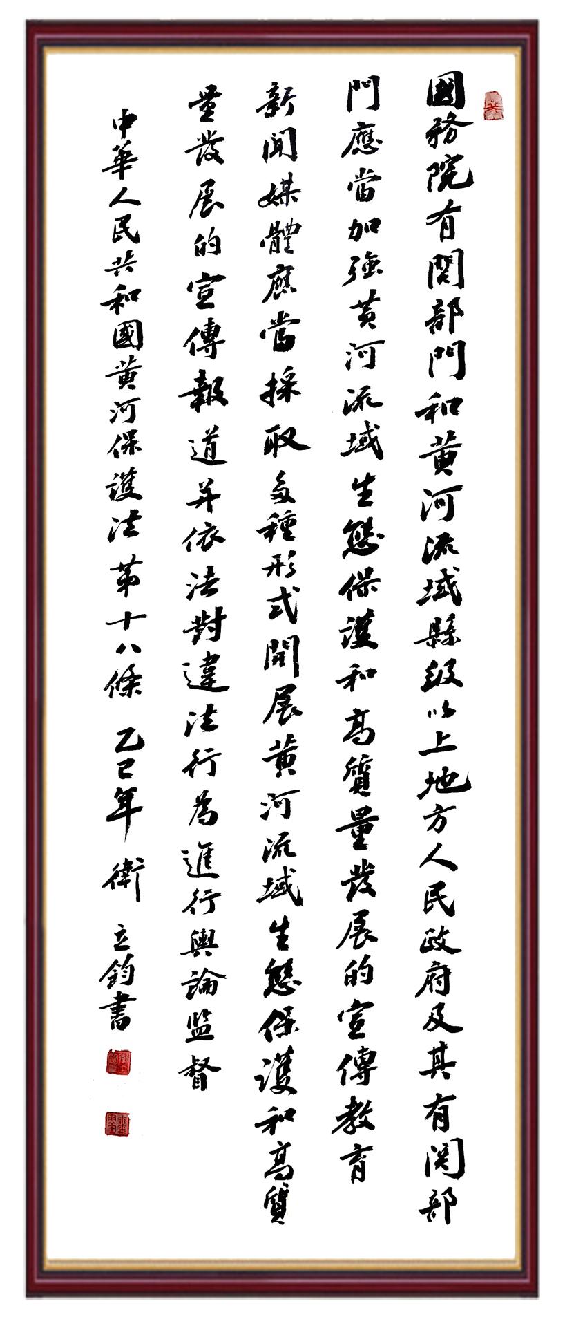 黃河寧,天下平。黃河是中華民族的發(fā)源地和搖籃,保護黃河是事關(guān)中華民族偉大復興的千秋大計?!吨腥A人民共和國黃河保護法》為推進水資源節(jié)約集約利用、保護傳承弘揚黃河文化、推動黃河流域生態(tài)保護和高質(zhì)量發(fā)展提供了有力法治保障。繼書寫《中華人民共和國民法典》《中華人民共和國憲法》《中華人民共和國澳門特別行政區(qū)基本法》《中華人民共和國香港特別行政區(qū)基本法》《中華人民共和國國旗法》《中華人民共和國國徽法》《中華人民共和國國歌法》《中華人民共和國法官法》等法律法規(guī)之后,法制日報社聯(lián)合沿黃九?。▍^(qū))司法廳、書法家協(xié)會,將筆端對準《中華人民共和國黃河保護法》。