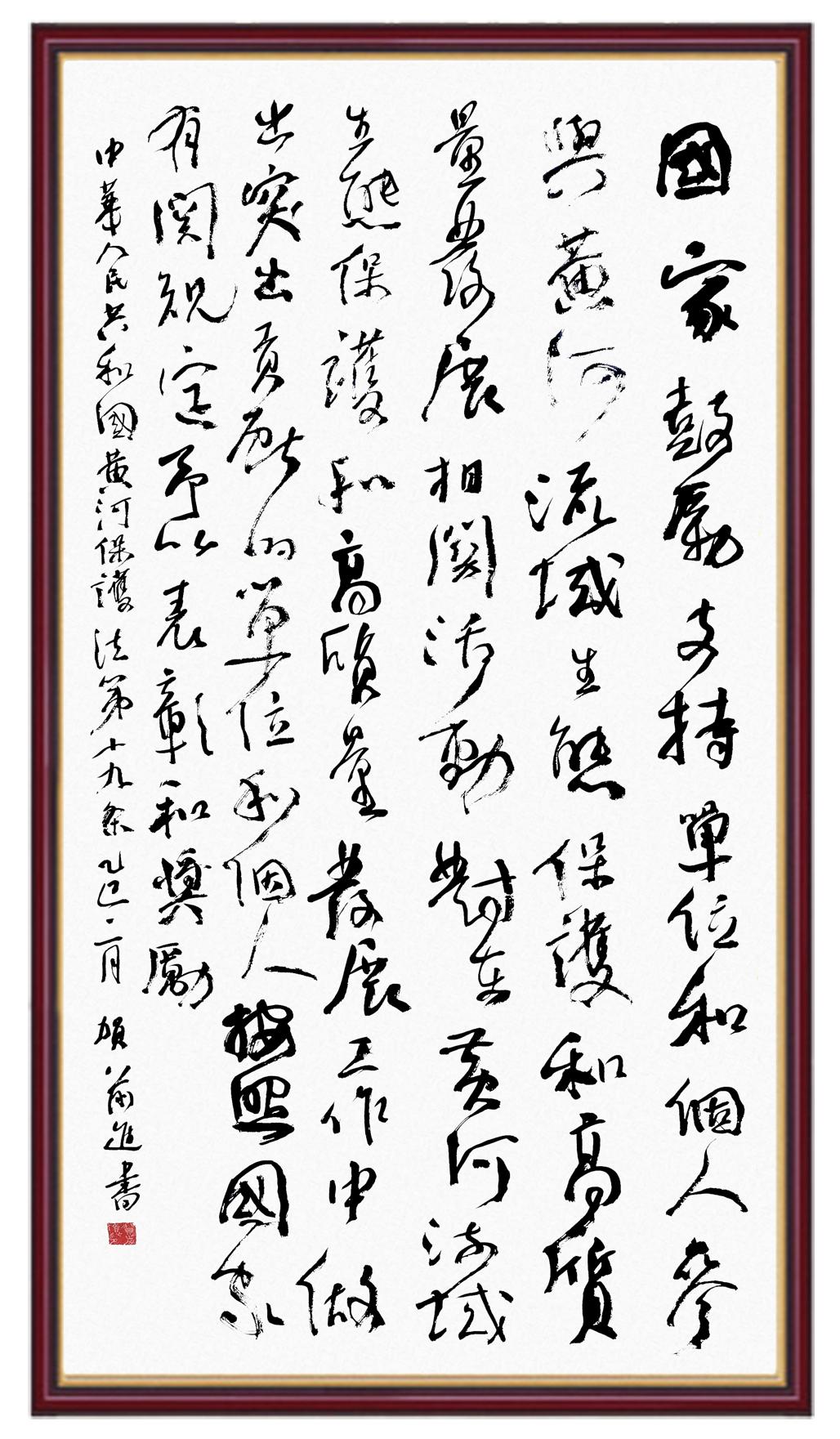 黃河寧,天下平。黃河是中華民族的發(fā)源地和搖籃,保護黃河是事關中華民族偉大復興的千秋大計。《中華人民共和國黃河保護法》為推進水資源節(jié)約集約利用、保護傳承弘揚黃河文化、推動黃河流域生態(tài)保護和高質量發(fā)展提供了有力法治保障。繼書寫《中華人民共和國民法典》《中華人民共和國憲法》《中華人民共和國澳門特別行政區(qū)基本法》《中華人民共和國香港特別行政區(qū)基本法》《中華人民共和國國旗法》《中華人民共和國國徽法》《中華人民共和國國歌法》《中華人民共和國法官法》等法律法規(guī)之后,法制日報社聯(lián)合沿黃九?。▍^(qū))司法廳、書法家協(xié)會,將筆端對準《中華人民共和國黃河保護法》。