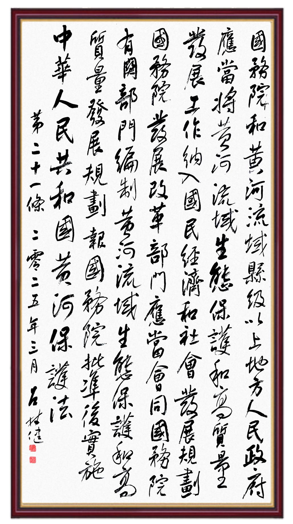 黃河寧,天下平。黃河是中華民族的發(fā)源地和搖籃,保護黃河是事關(guān)中華民族偉大復(fù)興的千秋大計。《中華人民共和國黃河保護法》為推進水資源節(jié)約集約利用、保護傳承弘揚黃河文化、推動黃河流域生態(tài)保護和高質(zhì)量發(fā)展提供了有力法治保障。繼書寫《中華人民共和國民法典》《中華人民共和國憲法》《中華人民共和國澳門特別行政區(qū)基本法》《中華人民共和國香港特別行政區(qū)基本法》《中華人民共和國國旗法》《中華人民共和國國徽法》《中華人民共和國國歌法》《中華人民共和國法官法》等法律法規(guī)之后,法制日報社聯(lián)合沿黃九?。▍^(qū))司法廳、書法家協(xié)會,將筆端對準《中華人民共和國黃河保護法》。