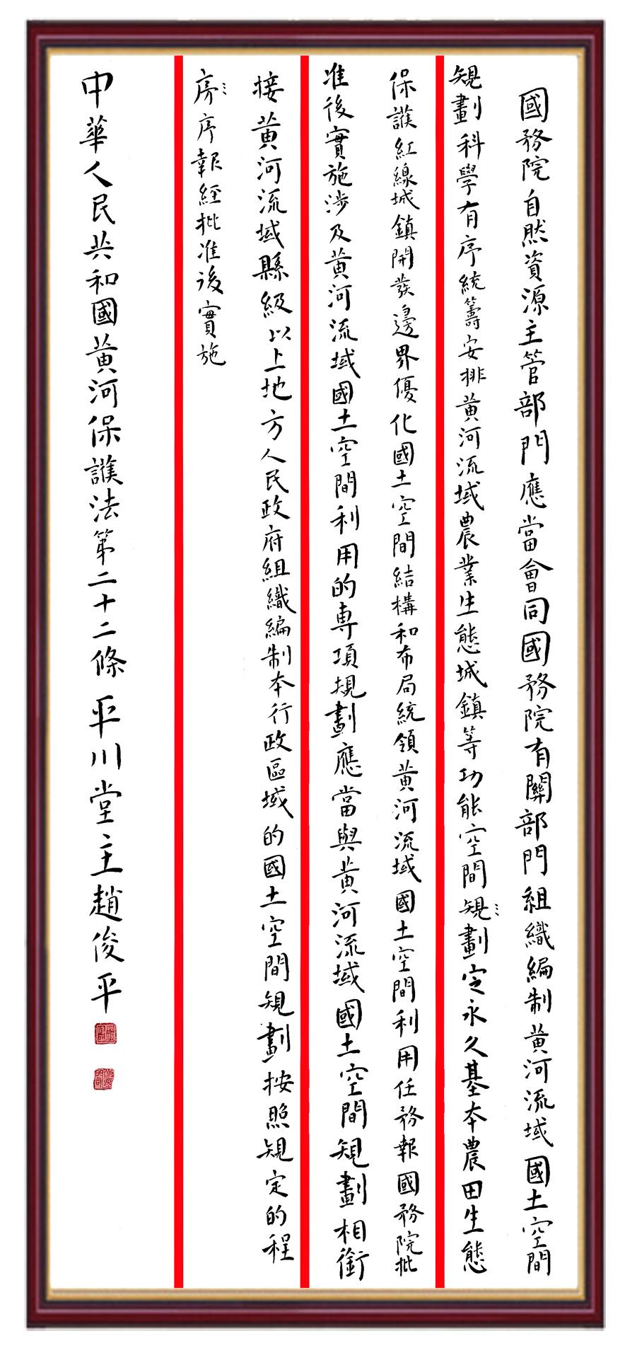 黃河寧,天下平。黃河是中華民族的發(fā)源地和搖籃,保護(hù)黃河是事關(guān)中華民族偉大復(fù)興的千秋大計(jì)。《中華人民共和國(guó)黃河保護(hù)法》為推進(jìn)水資源節(jié)約集約利用、保護(hù)傳承弘揚(yáng)黃河文化、推動(dòng)黃河流域生態(tài)保護(hù)和高質(zhì)量發(fā)展提供了有力法治保障。繼書(shū)寫(xiě)《中華人民共和國(guó)民法典》《中華人民共和國(guó)憲法》《中華人民共和國(guó)澳門(mén)特別行政區(qū)基本法》《中華人民共和國(guó)香港特別行政區(qū)基本法》《中華人民共和國(guó)國(guó)旗法》《中華人民共和國(guó)國(guó)徽法》《中華人民共和國(guó)國(guó)歌法》《中華人民共和國(guó)法官法》等法律法規(guī)之后,法制日?qǐng)?bào)社聯(lián)合沿黃九?。▍^(qū))司法廳、書(shū)法家協(xié)會(huì),將筆端對(duì)準(zhǔn)《中華人民共和國(guó)黃河保護(hù)法》。