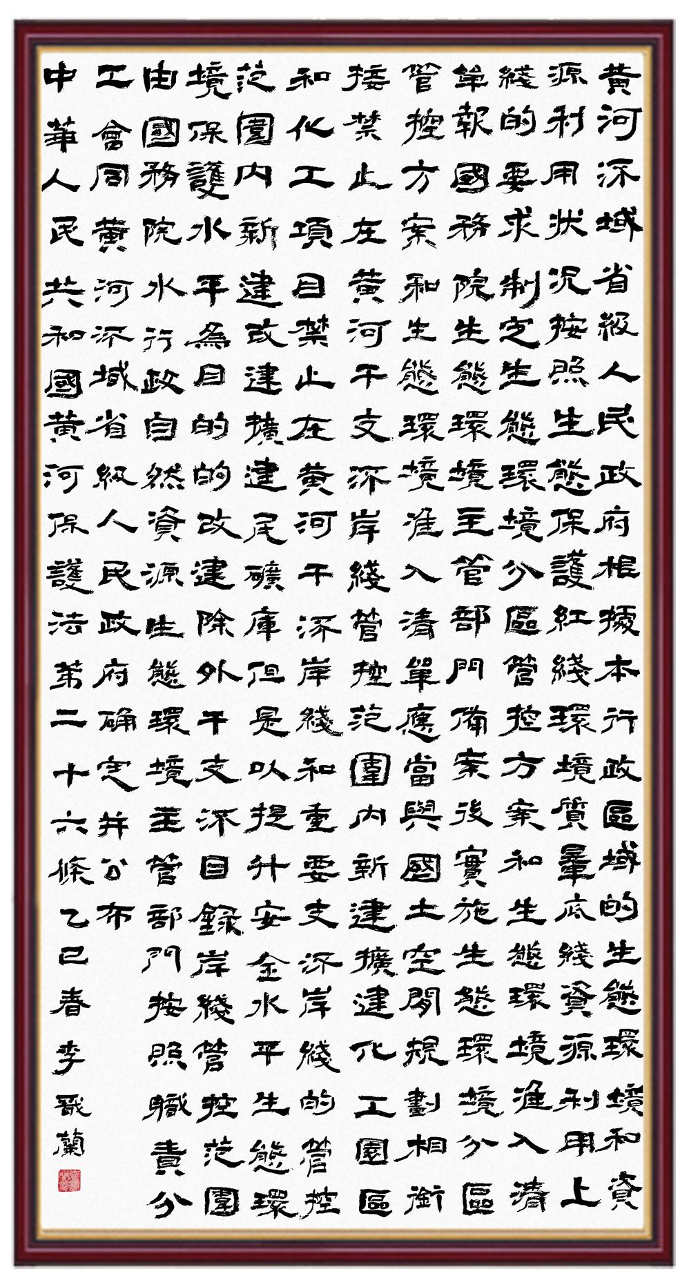 黃河寧,天下平。黃河是中華民族的發(fā)源地和搖籃,保護黃河是事關中華民族偉大復興的千秋大計?!吨腥A人民共和國黃河保護法》為推進水資源節(jié)約集約利用、保護傳承弘揚黃河文化、推動黃河流域生態(tài)保護和高質(zhì)量發(fā)展提供了有力法治保障。繼書寫《中華人民共和國民法典》《中華人民共和國憲法》《中華人民共和國澳門特別行政區(qū)基本法》《中華人民共和國香港特別行政區(qū)基本法》《中華人民共和國國旗法》《中華人民共和國國徽法》《中華人民共和國國歌法》《中華人民共和國法官法》等法律法規(guī)之后,法制日報社聯(lián)合沿黃九省(區(qū))司法廳、書法家協(xié)會,將筆端對準《中華人民共和國黃河保護法》。