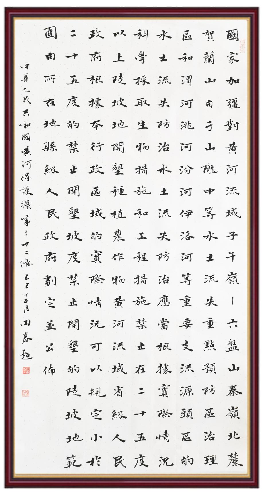 黃河寧,天下平。黃河是中華民族的發(fā)源地和搖籃,保護(hù)黃河是事關(guān)中華民族偉大復(fù)興的千秋大計(jì)。《中華人民共和國(guó)黃河保護(hù)法》為推進(jìn)水資源節(jié)約集約利用、保護(hù)傳承弘揚(yáng)黃河文化、推動(dòng)黃河流域生態(tài)保護(hù)和高質(zhì)量發(fā)展提供了有力法治保障。繼書寫《中華人民共和國(guó)民法典》《中華人民共和國(guó)憲法》《中華人民共和國(guó)澳門特別行政區(qū)基本法》《中華人民共和國(guó)香港特別行政區(qū)基本法》《中華人民共和國(guó)國(guó)旗法》《中華人民共和國(guó)國(guó)徽法》《中華人民共和國(guó)國(guó)歌法》《中華人民共和國(guó)法官法》等法律法規(guī)之后,法制日?qǐng)?bào)社聯(lián)合沿黃九?。▍^(qū))司法廳、書法家協(xié)會(huì),將筆端對(duì)準(zhǔn)《中華人民共和國(guó)黃河保護(hù)法》。