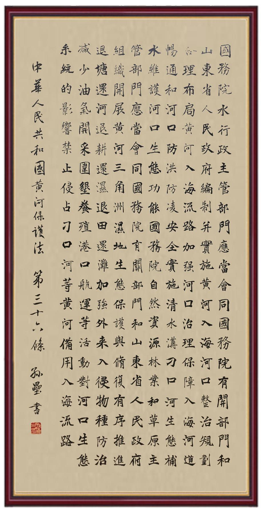 黃河寧,天下平。黃河是中華民族的發(fā)源地和搖籃,保護(hù)黃河是事關(guān)中華民族偉大復(fù)興的千秋大計(jì)?!吨腥A人民共和國黃河保護(hù)法》為推進(jìn)水資源節(jié)約集約利用、保護(hù)傳承弘揚(yáng)黃河文化、推動(dòng)黃河流域生態(tài)保護(hù)和高質(zhì)量發(fā)展提供了有力法治保障。繼書寫《中華人民共和國民法典》《中華人民共和國憲法》《中華人民共和國澳門特別行政區(qū)基本法》《中華人民共和國香港特別行政區(qū)基本法》《中華人民共和國國旗法》《中華人民共和國國徽法》《中華人民共和國國歌法》《中華人民共和國法官法》等法律法規(guī)之后,法制日?qǐng)?bào)社聯(lián)合沿黃九省(區(qū))司法廳、書法家協(xié)會(huì),將筆端對(duì)準(zhǔn)《中華人民共和國黃河保護(hù)法》。