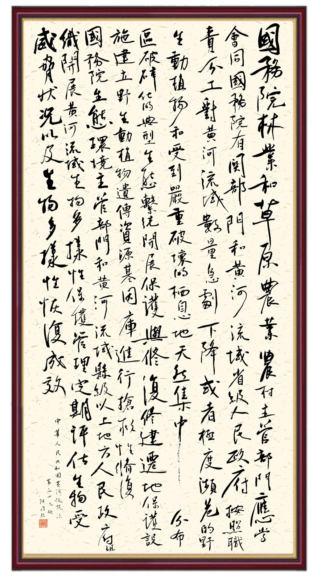 黃河寧,天下平。黃河是中華民族的發(fā)源地和搖籃,保護(hù)黃河是事關(guān)中華民族偉大復(fù)興的千秋大計(jì)?!吨腥A人民共和國(guó)黃河保護(hù)法》為推進(jìn)水資源節(jié)約集約利用、保護(hù)傳承弘揚(yáng)黃河文化、推動(dòng)黃河流域生態(tài)保護(hù)和高質(zhì)量發(fā)展提供了有力法治保障。繼書(shū)寫(xiě)《中華人民共和國(guó)民法典》《中華人民共和國(guó)憲法》《中華人民共和國(guó)澳門(mén)特別行政區(qū)基本法》《中華人民共和國(guó)香港特別行政區(qū)基本法》《中華人民共和國(guó)國(guó)旗法》《中華人民共和國(guó)國(guó)徽法》《中華人民共和國(guó)國(guó)歌法》《中華人民共和國(guó)法官法》等法律法規(guī)之后,法制日?qǐng)?bào)社聯(lián)合沿黃九?。▍^(qū))司法廳、書(shū)法家協(xié)會(huì),將筆端對(duì)準(zhǔn)《中華人民共和國(guó)黃河保護(hù)法》。