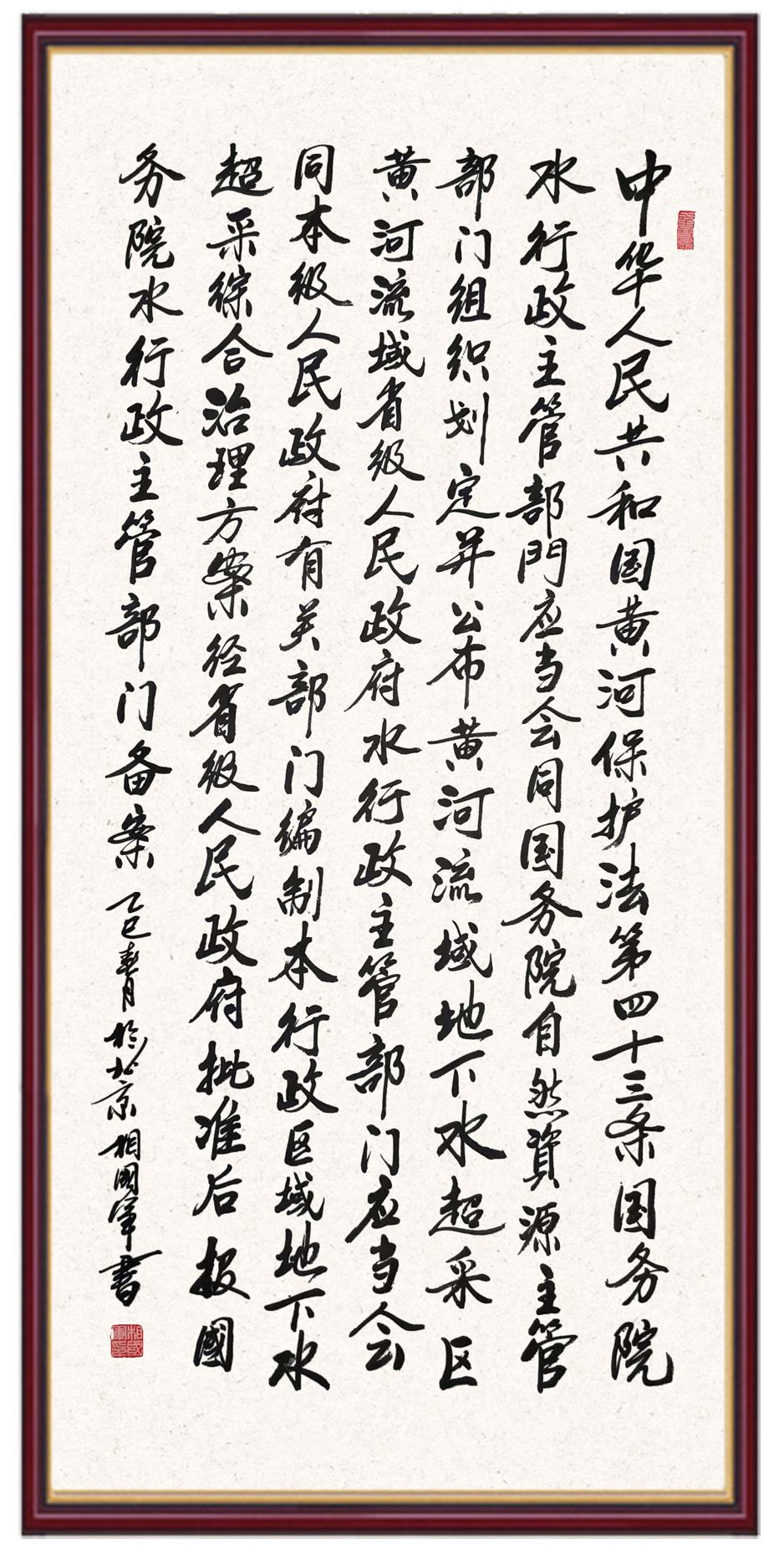 黃河寧,天下平。黃河是中華民族的發(fā)源地和搖籃,保護(hù)黃河是事關(guān)中華民族偉大復(fù)興的千秋大計?!吨腥A人民共和國黃河保護(hù)法》為推進(jìn)水資源節(jié)約集約利用、保護(hù)傳承弘揚黃河文化、推動黃河流域生態(tài)保護(hù)和高質(zhì)量發(fā)展提供了有力法治保障。繼書寫《中華人民共和國民法典》《中華人民共和國憲法》《中華人民共和國澳門特別行政區(qū)基本法》《中華人民共和國香港特別行政區(qū)基本法》《中華人民共和國國旗法》《中華人民共和國國徽法》《中華人民共和國國歌法》《中華人民共和國法官法》等法律法規(guī)之后,法制日報社聯(lián)合沿黃九?。▍^(qū))司法廳、書法家協(xié)會,將筆端對準(zhǔn)《中華人民共和國黃河保護(hù)法》。