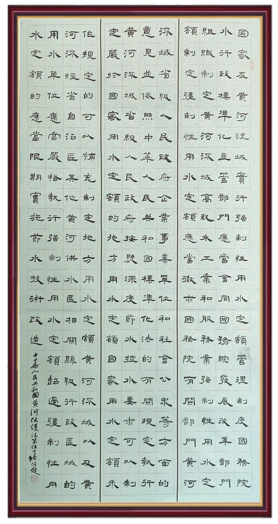 黃河寧,天下平。黃河是中華民族的發(fā)源地和搖籃,保護黃河是事關(guān)中華民族偉大復(fù)興的千秋大計?!吨腥A人民共和國黃河保護法》為推進水資源節(jié)約集約利用、保護傳承弘揚黃河文化、推動黃河流域生態(tài)保護和高質(zhì)量發(fā)展提供了有力法治保障。繼書寫《中華人民共和國民法典》《中華人民共和國憲法》《中華人民共和國澳門特別行政區(qū)基本法》《中華人民共和國香港特別行政區(qū)基本法》《中華人民共和國國旗法》《中華人民共和國國徽法》《中華人民共和國國歌法》《中華人民共和國法官法》等法律法規(guī)之后,法制日報社聯(lián)合沿黃九?。▍^(qū))司法廳、書法家協(xié)會,將筆端對準(zhǔn)《中華人民共和國黃河保護法》。