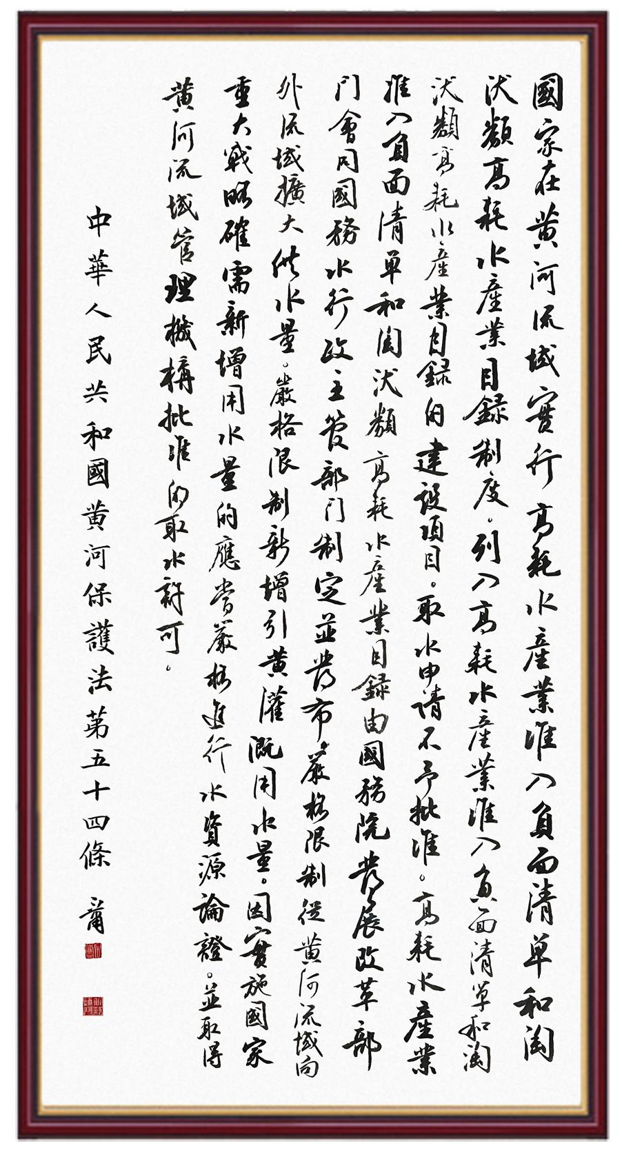 黃河寧,天下平。黃河是中華民族的發(fā)源地和搖籃,保護(hù)黃河是事關(guān)中華民族偉大復(fù)興的千秋大計。《中華人民共和國黃河保護(hù)法》為推進(jìn)水資源節(jié)約集約利用、保護(hù)傳承弘揚黃河文化、推動黃河流域生態(tài)保護(hù)和高質(zhì)量發(fā)展提供了有力法治保障。繼書寫《中華人民共和國民法典》《中華人民共和國憲法》《中華人民共和國澳門特別行政區(qū)基本法》《中華人民共和國香港特別行政區(qū)基本法》《中華人民共和國國旗法》《中華人民共和國國徽法》《中華人民共和國國歌法》《中華人民共和國法官法》等法律法規(guī)之后,法制日報社聯(lián)合沿黃九?。▍^(qū))司法廳、書法家協(xié)會,將筆端對準(zhǔn)《中華人民共和國黃河保護(hù)法》。