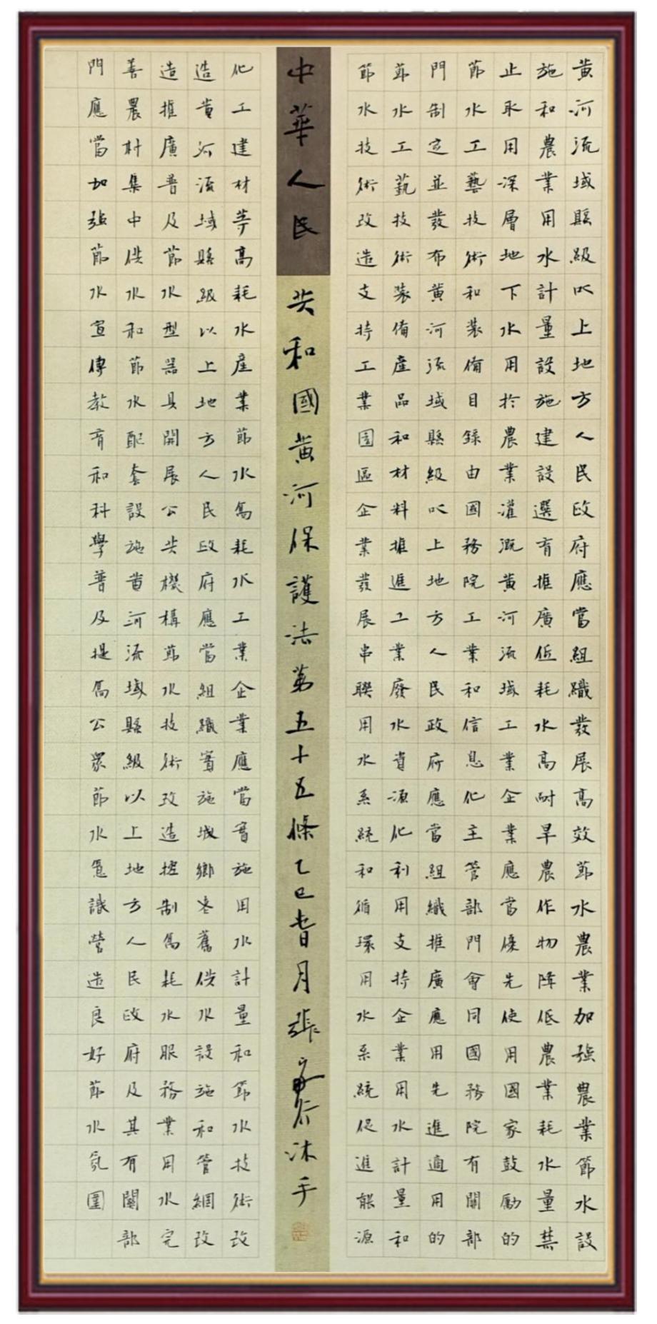 黃河寧,天下平。黃河是中華民族的發(fā)源地和搖籃,保護(hù)黃河是事關(guān)中華民族偉大復(fù)興的千秋大計(jì)?!吨腥A人民共和國(guó)黃河保護(hù)法》為推進(jìn)水資源節(jié)約集約利用、保護(hù)傳承弘揚(yáng)黃河文化、推動(dòng)黃河流域生態(tài)保護(hù)和高質(zhì)量發(fā)展提供了有力法治保障。繼書寫《中華人民共和國(guó)民法典》《中華人民共和國(guó)憲法》《中華人民共和國(guó)澳門特別行政區(qū)基本法》《中華人民共和國(guó)香港特別行政區(qū)基本法》《中華人民共和國(guó)國(guó)旗法》《中華人民共和國(guó)國(guó)徽法》《中華人民共和國(guó)國(guó)歌法》《中華人民共和國(guó)法官法》等法律法規(guī)之后,法制日?qǐng)?bào)社聯(lián)合沿黃九?。▍^(qū))司法廳、書法家協(xié)會(huì),將筆端對(duì)準(zhǔn)《中華人民共和國(guó)黃河保護(hù)法》。