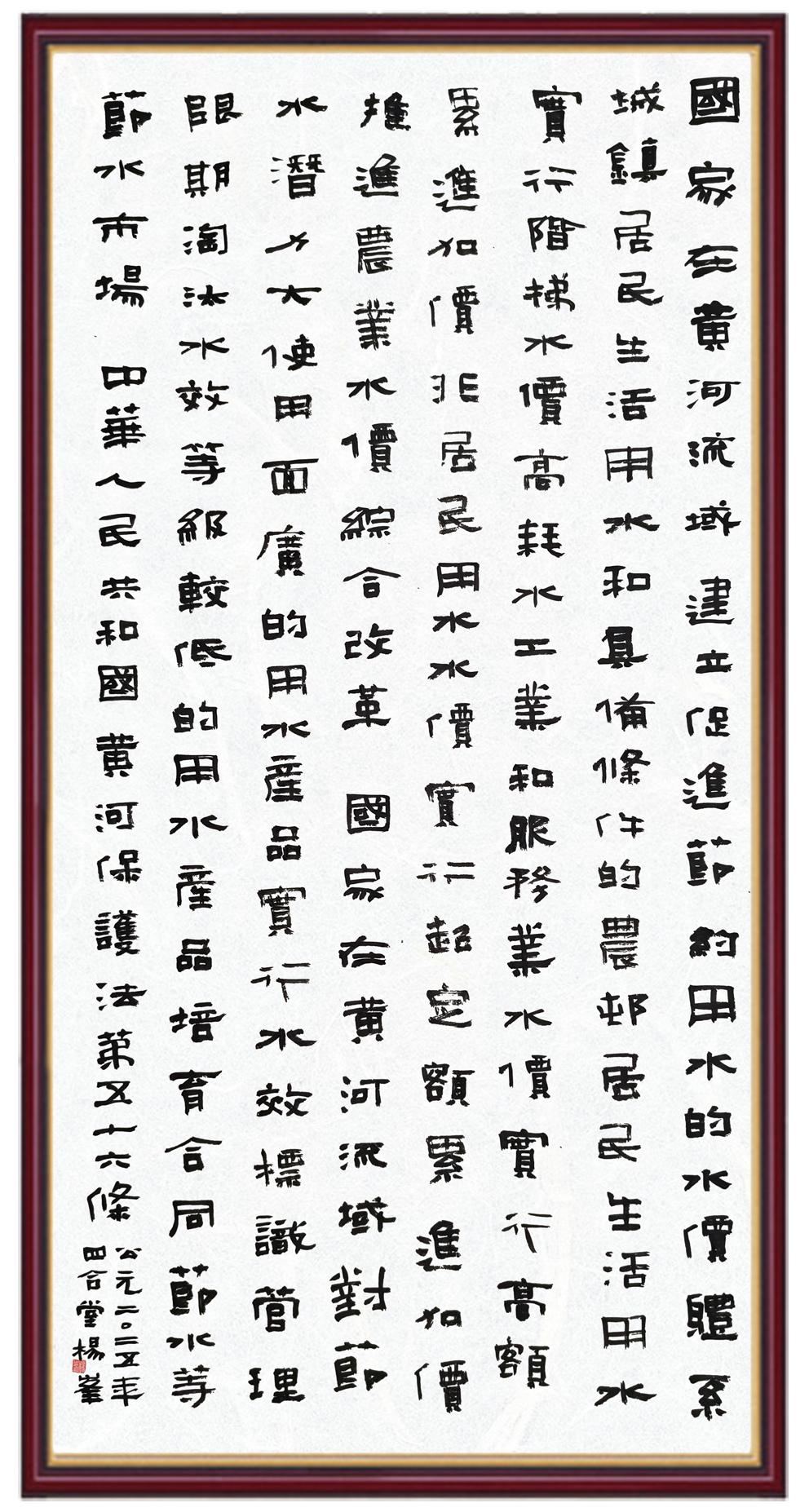 黃河寧,天下平。黃河是中華民族的發(fā)源地和搖籃,保護黃河是事關(guān)中華民族偉大復(fù)興的千秋大計?!吨腥A人民共和國黃河保護法》為推進水資源節(jié)約集約利用、保護傳承弘揚黃河文化、推動黃河流域生態(tài)保護和高質(zhì)量發(fā)展提供了有力法治保障。繼書寫《中華人民共和國民法典》《中華人民共和國憲法》《中華人民共和國澳門特別行政區(qū)基本法》《中華人民共和國香港特別行政區(qū)基本法》《中華人民共和國國旗法》《中華人民共和國國徽法》《中華人民共和國國歌法》《中華人民共和國法官法》等法律法規(guī)之后,法制日報社聯(lián)合沿黃九?。▍^(qū))司法廳、書法家協(xié)會,將筆端對準(zhǔn)《中華人民共和國黃河保護法》。