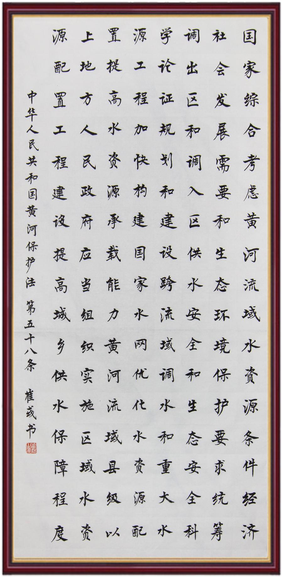 黃河寧,天下平。黃河是中華民族的發(fā)源地和搖籃,保護(hù)黃河是事關(guān)中華民族偉大復(fù)興的千秋大計(jì)?!吨腥A人民共和國(guó)黃河保護(hù)法》為推進(jìn)水資源節(jié)約集約利用、保護(hù)傳承弘揚(yáng)黃河文化、推動(dòng)黃河流域生態(tài)保護(hù)和高質(zhì)量發(fā)展提供了有力法治保障。繼書(shū)寫(xiě)《中華人民共和國(guó)民法典》《中華人民共和國(guó)憲法》《中華人民共和國(guó)澳門(mén)特別行政區(qū)基本法》《中華人民共和國(guó)香港特別行政區(qū)基本法》《中華人民共和國(guó)國(guó)旗法》《中華人民共和國(guó)國(guó)徽法》《中華人民共和國(guó)國(guó)歌法》《中華人民共和國(guó)法官法》等法律法規(guī)之后,法制日?qǐng)?bào)社聯(lián)合沿黃九?。▍^(qū))司法廳、書(shū)法家協(xié)會(huì),將筆端對(duì)準(zhǔn)《中華人民共和國(guó)黃河保護(hù)法》。