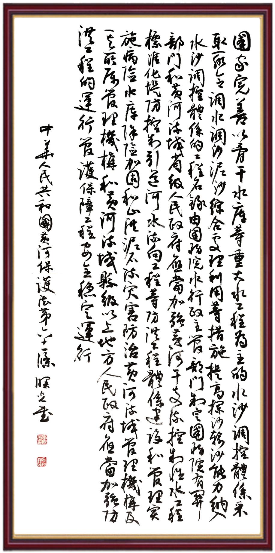 黃河寧,天下平。黃河是中華民族的發(fā)源地和搖籃,保護(hù)黃河是事關(guān)中華民族偉大復(fù)興的千秋大計(jì)?!吨腥A人民共和國黃河保護(hù)法》為推進(jìn)水資源節(jié)約集約利用、保護(hù)傳承弘揚(yáng)黃河文化、推動(dòng)黃河流域生態(tài)保護(hù)和高質(zhì)量發(fā)展提供了有力法治保障。繼書寫《中華人民共和國民法典》《中華人民共和國憲法》《中華人民共和國澳門特別行政區(qū)基本法》《中華人民共和國香港特別行政區(qū)基本法》《中華人民共和國國旗法》《中華人民共和國國徽法》《中華人民共和國國歌法》《中華人民共和國法官法》等法律法規(guī)之后,法制日?qǐng)?bào)社聯(lián)合沿黃九?。▍^(qū))司法廳、書法家協(xié)會(huì),將筆端對(duì)準(zhǔn)《中華人民共和國黃河保護(hù)法》。