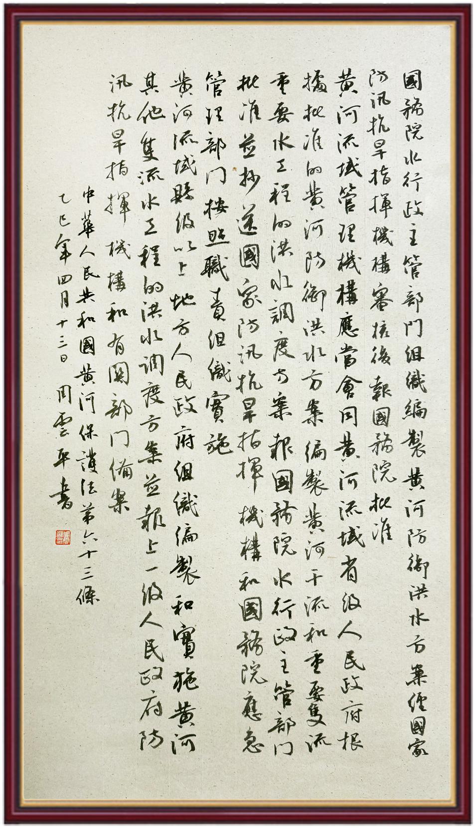 黃河寧,天下平。黃河是中華民族的發(fā)源地和搖籃,保護黃河是事關(guān)中華民族偉大復興的千秋大計?!吨腥A人民共和國黃河保護法》為推進水資源節(jié)約集約利用、保護傳承弘揚黃河文化、推動黃河流域生態(tài)保護和高質(zhì)量發(fā)展提供了有力法治保障。繼書寫《中華人民共和國民法典》《中華人民共和國憲法》《中華人民共和國澳門特別行政區(qū)基本法》《中華人民共和國香港特別行政區(qū)基本法》《中華人民共和國國旗法》《中華人民共和國國徽法》《中華人民共和國國歌法》《中華人民共和國法官法》等法律法規(guī)之后,法制日報社聯(lián)合沿黃九?。▍^(qū))司法廳、書法家協(xié)會,將筆端對準《中華人民共和國黃河保護法》。