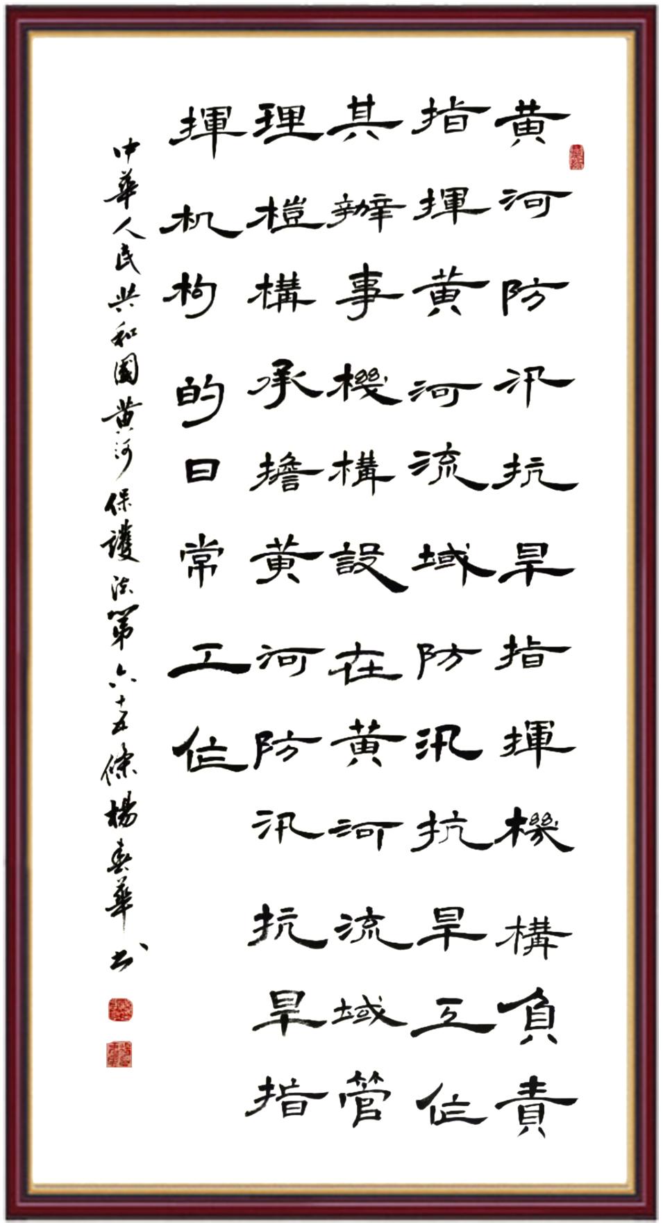 黃河寧,天下平。黃河是中華民族的發(fā)源地和搖籃,保護(hù)黃河是事關(guān)中華民族偉大復(fù)興的千秋大計(jì)?!吨腥A人民共和國(guó)黃河保護(hù)法》為推進(jìn)水資源節(jié)約集約利用、保護(hù)傳承弘揚(yáng)黃河文化、推動(dòng)黃河流域生態(tài)保護(hù)和高質(zhì)量發(fā)展提供了有力法治保障。繼書寫《中華人民共和國(guó)民法典》《中華人民共和國(guó)憲法》《中華人民共和國(guó)澳門特別行政區(qū)基本法》《中華人民共和國(guó)香港特別行政區(qū)基本法》《中華人民共和國(guó)國(guó)旗法》《中華人民共和國(guó)國(guó)徽法》《中華人民共和國(guó)國(guó)歌法》《中華人民共和國(guó)法官法》等法律法規(guī)之后,法制日?qǐng)?bào)社聯(lián)合沿黃九省(區(qū))司法廳、書法家協(xié)會(huì),將筆端對(duì)準(zhǔn)《中華人民共和國(guó)黃河保護(hù)法》。
