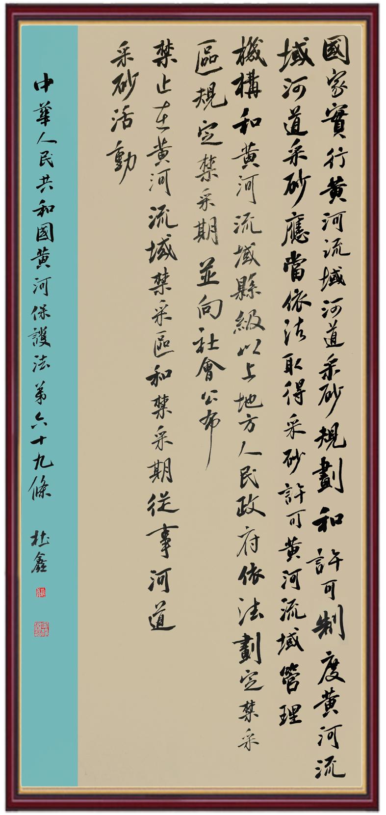 黃河寧,天下平。黃河是中華民族的發(fā)源地和搖籃,保護(hù)黃河是事關(guān)中華民族偉大復(fù)興的千秋大計?!吨腥A人民共和國黃河保護(hù)法》為推進(jìn)水資源節(jié)約集約利用、保護(hù)傳承弘揚(yáng)黃河文化、推動黃河流域生態(tài)保護(hù)和高質(zhì)量發(fā)展提供了有力法治保障。繼書寫《中華人民共和國民法典》《中華人民共和國憲法》《中華人民共和國澳門特別行政區(qū)基本法》《中華人民共和國香港特別行政區(qū)基本法》《中華人民共和國國旗法》《中華人民共和國國徽法》《中華人民共和國國歌法》《中華人民共和國法官法》等法律法規(guī)之后,法制日報社聯(lián)合沿黃九?。▍^(qū))司法廳、書法家協(xié)會,將筆端對準(zhǔn)《中華人民共和國黃河保護(hù)法》。