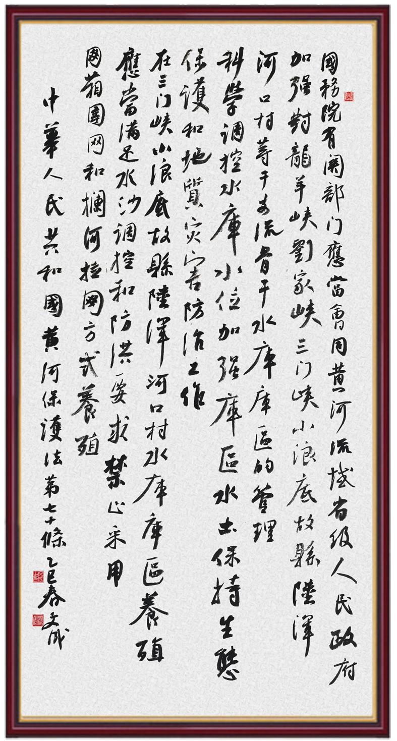 黃河寧,天下平。黃河是中華民族的發(fā)源地和搖籃,保護黃河是事關(guān)中華民族偉大復(fù)興的千秋大計。《中華人民共和國黃河保護法》為推進水資源節(jié)約集約利用、保護傳承弘揚黃河文化、推動黃河流域生態(tài)保護和高質(zhì)量發(fā)展提供了有力法治保障。繼書寫《中華人民共和國民法典》《中華人民共和國憲法》《中華人民共和國澳門特別行政區(qū)基本法》《中華人民共和國香港特別行政區(qū)基本法》《中華人民共和國國旗法》《中華人民共和國國徽法》《中華人民共和國國歌法》《中華人民共和國法官法》等法律法規(guī)之后,法制日報社聯(lián)合沿黃九?。▍^(qū))司法廳、書法家協(xié)會,將筆端對準《中華人民共和國黃河保護法》。