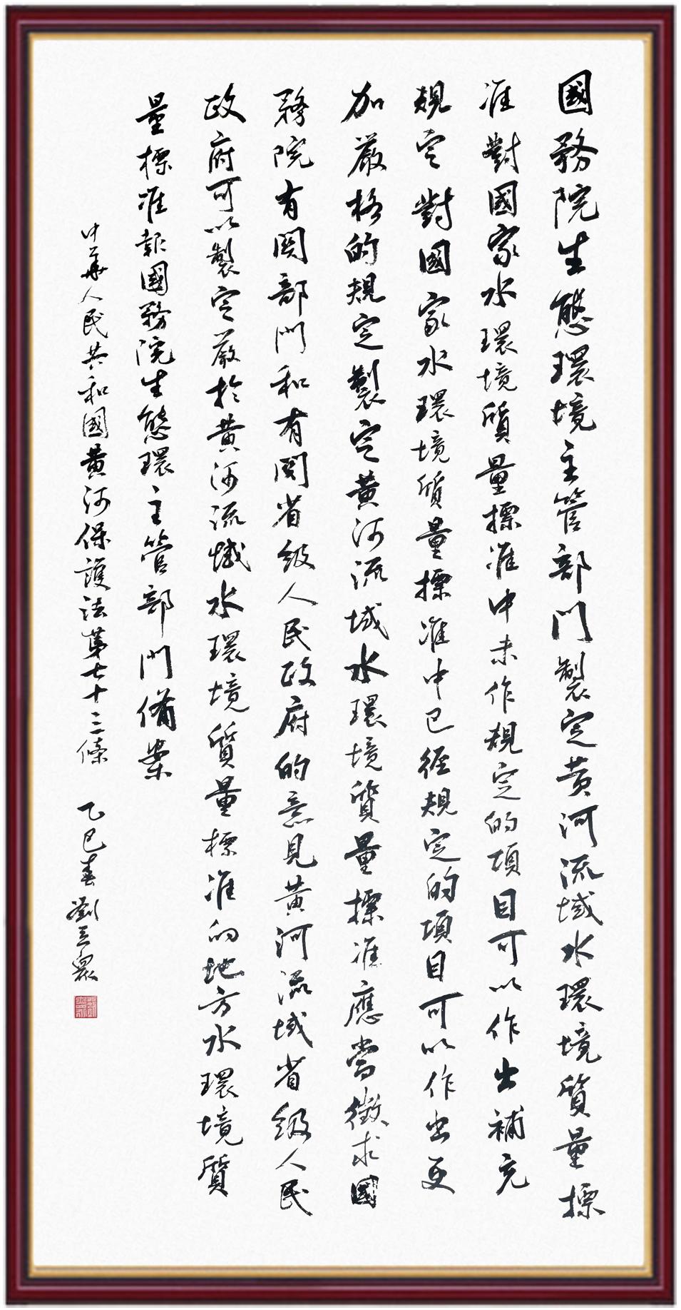 黃河寧,天下平。黃河是中華民族的發(fā)源地和搖籃,保護(hù)黃河是事關(guān)中華民族偉大復(fù)興的千秋大計(jì)。《中華人民共和國(guó)黃河保護(hù)法》為推進(jìn)水資源節(jié)約集約利用、保護(hù)傳承弘揚(yáng)黃河文化、推動(dòng)黃河流域生態(tài)保護(hù)和高質(zhì)量發(fā)展提供了有力法治保障。繼書寫《中華人民共和國(guó)民法典》《中華人民共和國(guó)憲法》《中華人民共和國(guó)澳門特別行政區(qū)基本法》《中華人民共和國(guó)香港特別行政區(qū)基本法》《中華人民共和國(guó)國(guó)旗法》《中華人民共和國(guó)國(guó)徽法》《中華人民共和國(guó)國(guó)歌法》《中華人民共和國(guó)法官法》等法律法規(guī)之后,法制日?qǐng)?bào)社聯(lián)合沿黃九?。▍^(qū))司法廳、書法家協(xié)會(huì),將筆端對(duì)準(zhǔn)《中華人民共和國(guó)黃河保護(hù)法》。