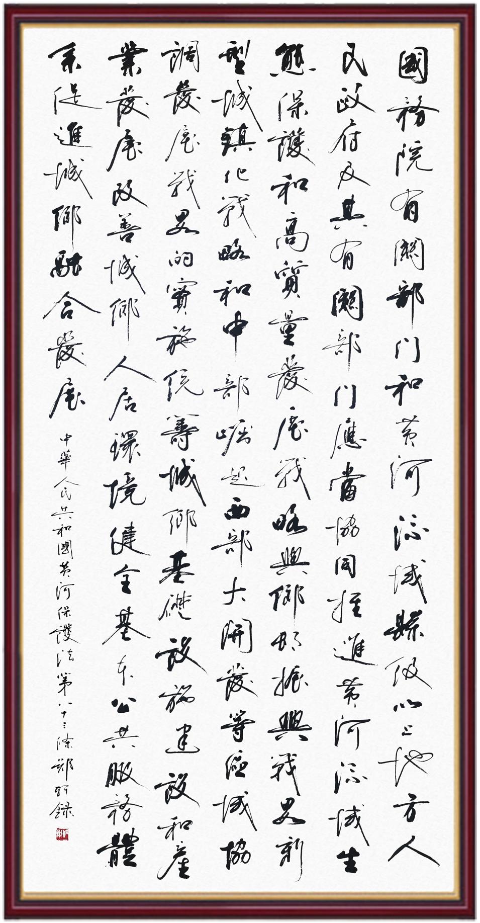 黃河寧,天下平。黃河是中華民族的發(fā)源地和搖籃,保護黃河是事關(guān)中華民族偉大復(fù)興的千秋大計?!吨腥A人民共和國黃河保護法》為推進水資源節(jié)約集約利用、保護傳承弘揚黃河文化、推動黃河流域生態(tài)保護和高質(zhì)量發(fā)展提供了有力法治保障。繼書寫《中華人民共和國民法典》《中華人民共和國憲法》《中華人民共和國澳門特別行政區(qū)基本法》《中華人民共和國香港特別行政區(qū)基本法》《中華人民共和國國旗法》《中華人民共和國國徽法》《中華人民共和國國歌法》《中華人民共和國法官法》等法律法規(guī)之后,法制日報社聯(lián)合沿黃九?。▍^(qū))司法廳、書法家協(xié)會,將筆端對準《中華人民共和國黃河保護法》。
