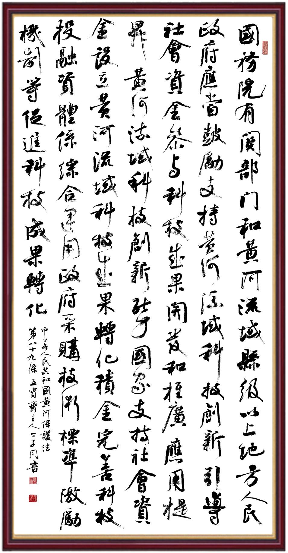 黃河寧,天下平。黃河是中華民族的發(fā)源地和搖籃,保護黃河是事關中華民族偉大復興的千秋大計?!吨腥A人民共和國黃河保護法》為推進水資源節(jié)約集約利用、保護傳承弘揚黃河文化、推動黃河流域生態(tài)保護和高質量發(fā)展提供了有力法治保障。繼書寫《中華人民共和國民法典》《中華人民共和國憲法》《中華人民共和國澳門特別行政區(qū)基本法》《中華人民共和國香港特別行政區(qū)基本法》《中華人民共和國國旗法》《中華人民共和國國徽法》《中華人民共和國國歌法》《中華人民共和國法官法》等法律法規(guī)之后,法制日報社聯(lián)合沿黃九省(區(qū))司法廳、書法家協(xié)會,將筆端對準《中華人民共和國黃河保護法》。